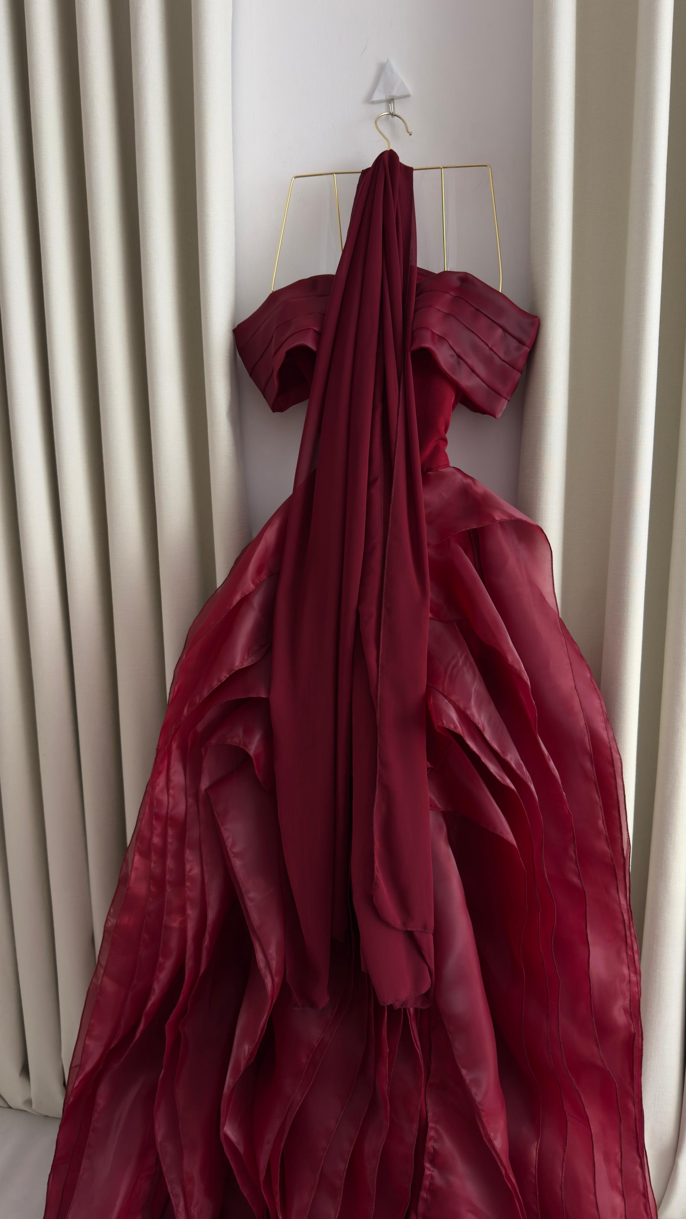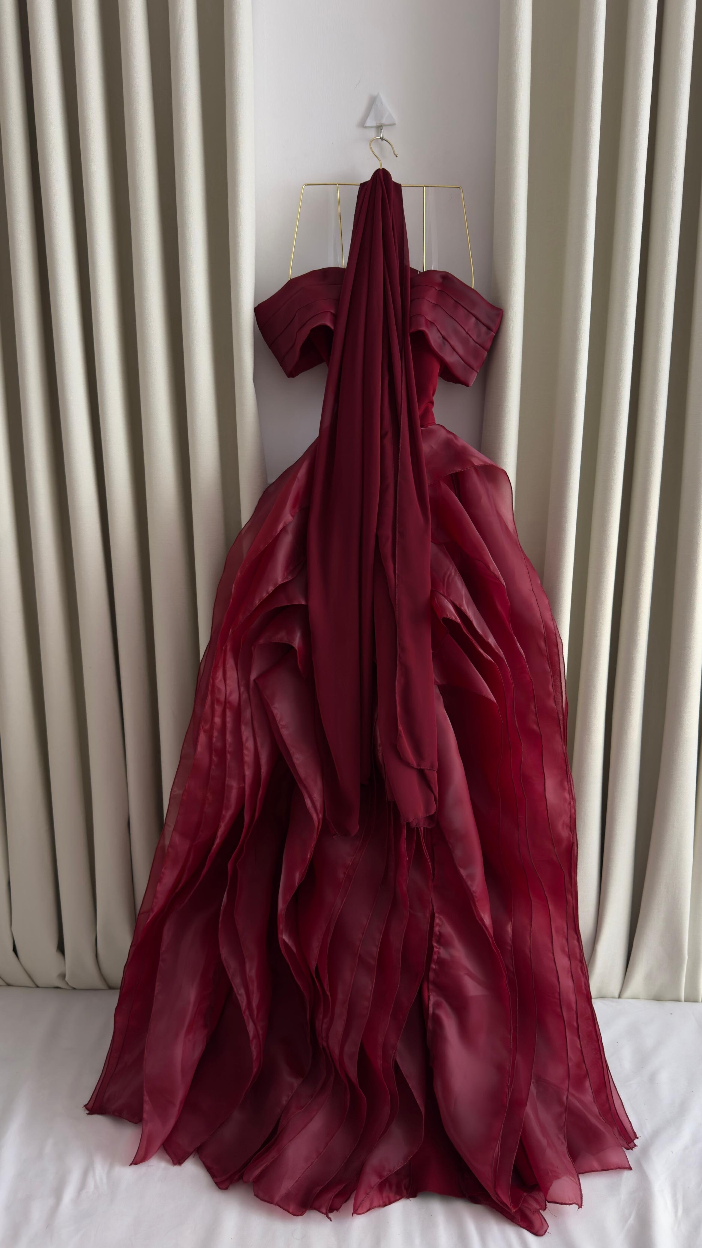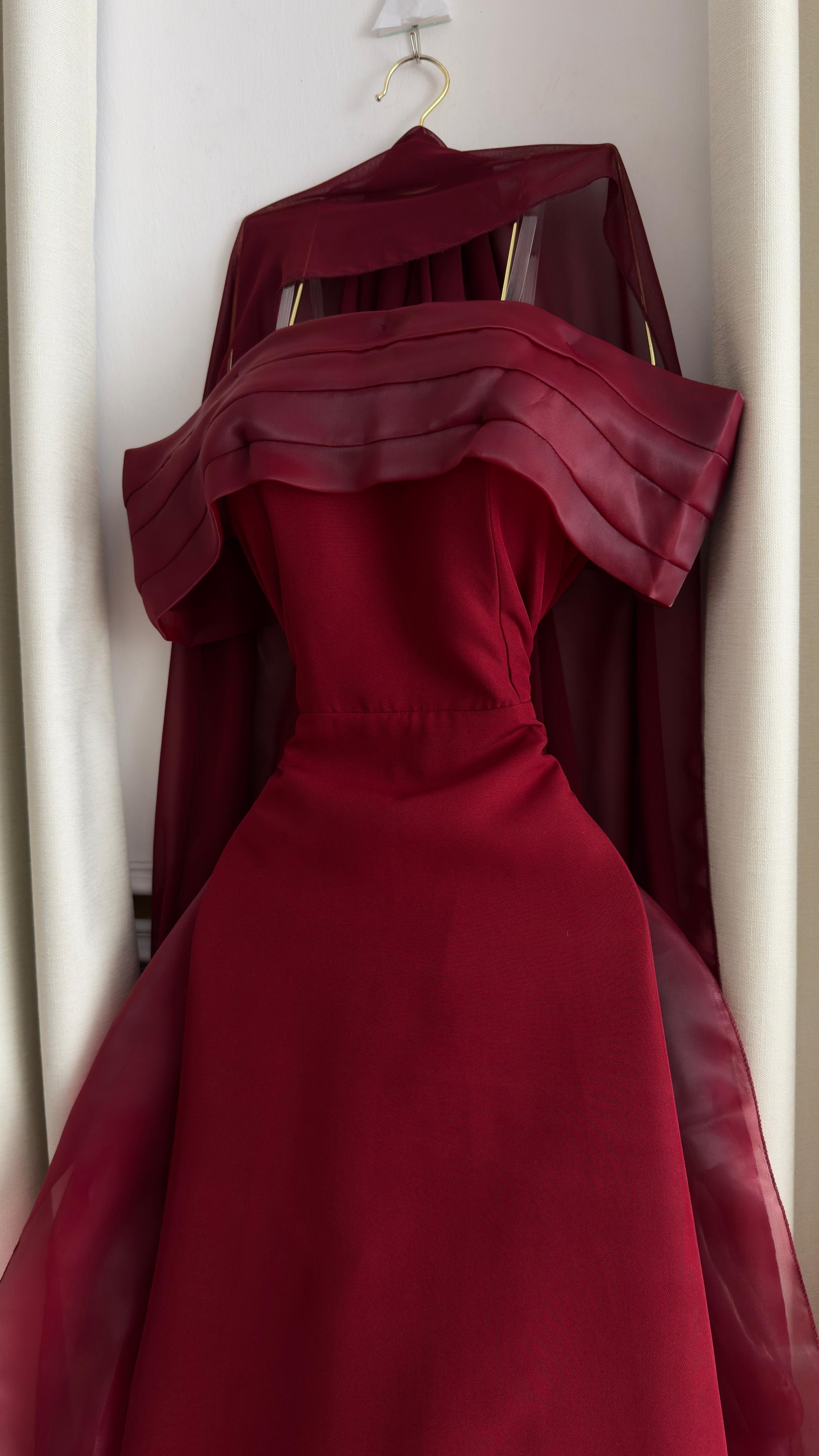 فستان سهرة ملكي باللون الأحمر الفاخر، مصمم بقصة أوف شولدر عريضة مع خطوط مطوية أنيقة وكاب انسيابي طويل يضفي لمسة درامية ساحرة. القماش الفاخر يمنح إطلالة قوية وأنثوية في آن واحد، لتكوني محط الأنظار في السهرات الفاخرة والمناسبات الخاصة.