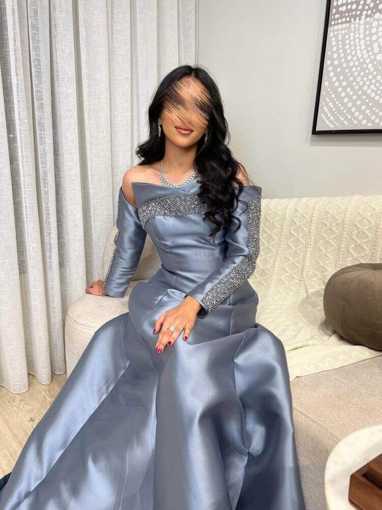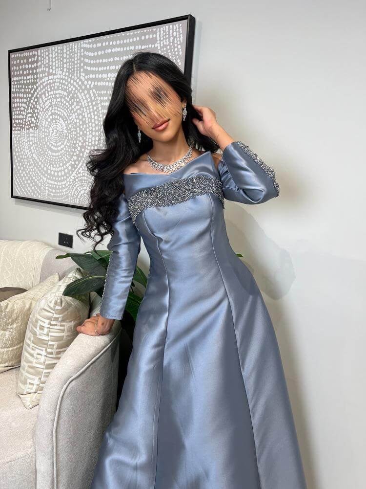 هذا الفستان الراقي باللون الأزرق الملكي يعكس الفخامة والأنوثة في كل تفاصيله. يتميز بتصميم طويل مع أكمام ضيقة مزينة بلمسات كريستالية فاخرة، بينما يزين الصدر شريط مطرز بقطع براقة تضفي إشراقة أنثوية راقية. القصة الناعمة تنساب برقي لتمنحك حضورًا أنيقًا في أي مناسبة خاصة.