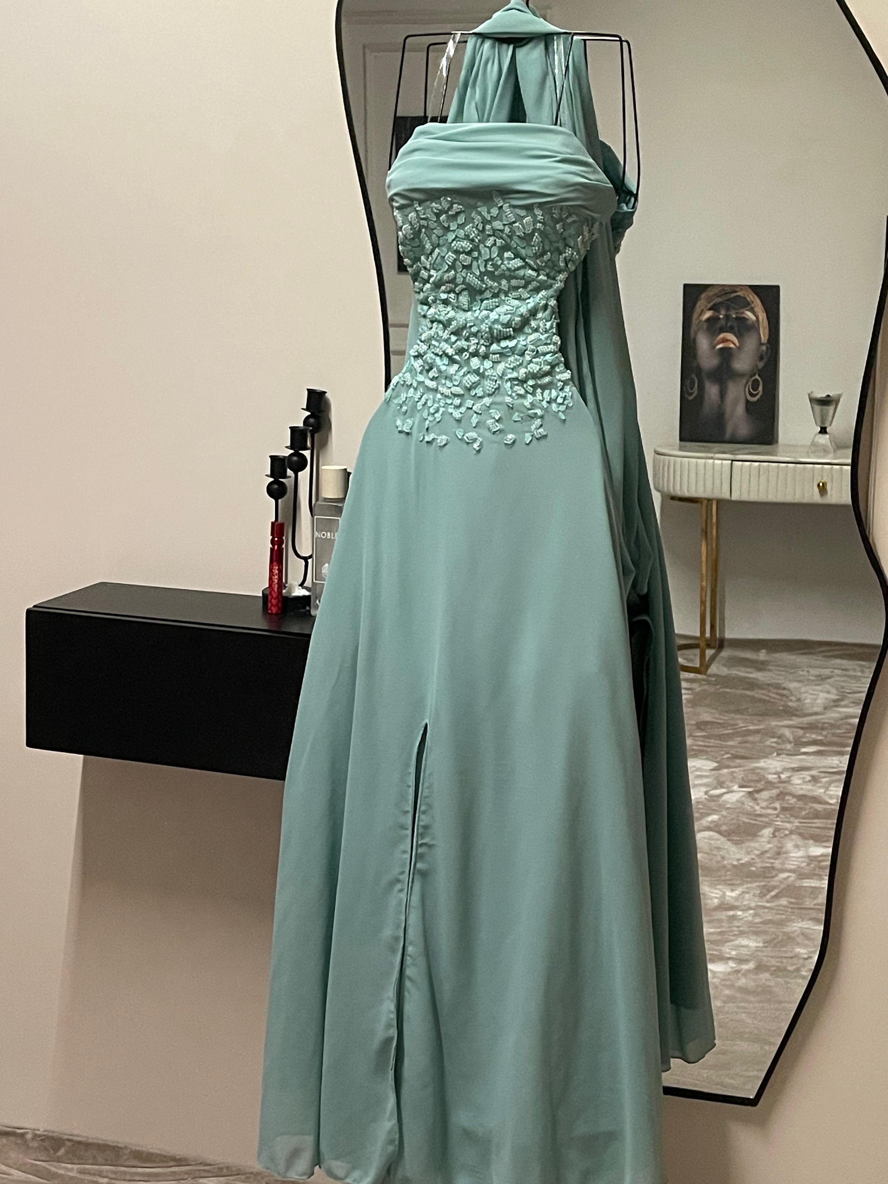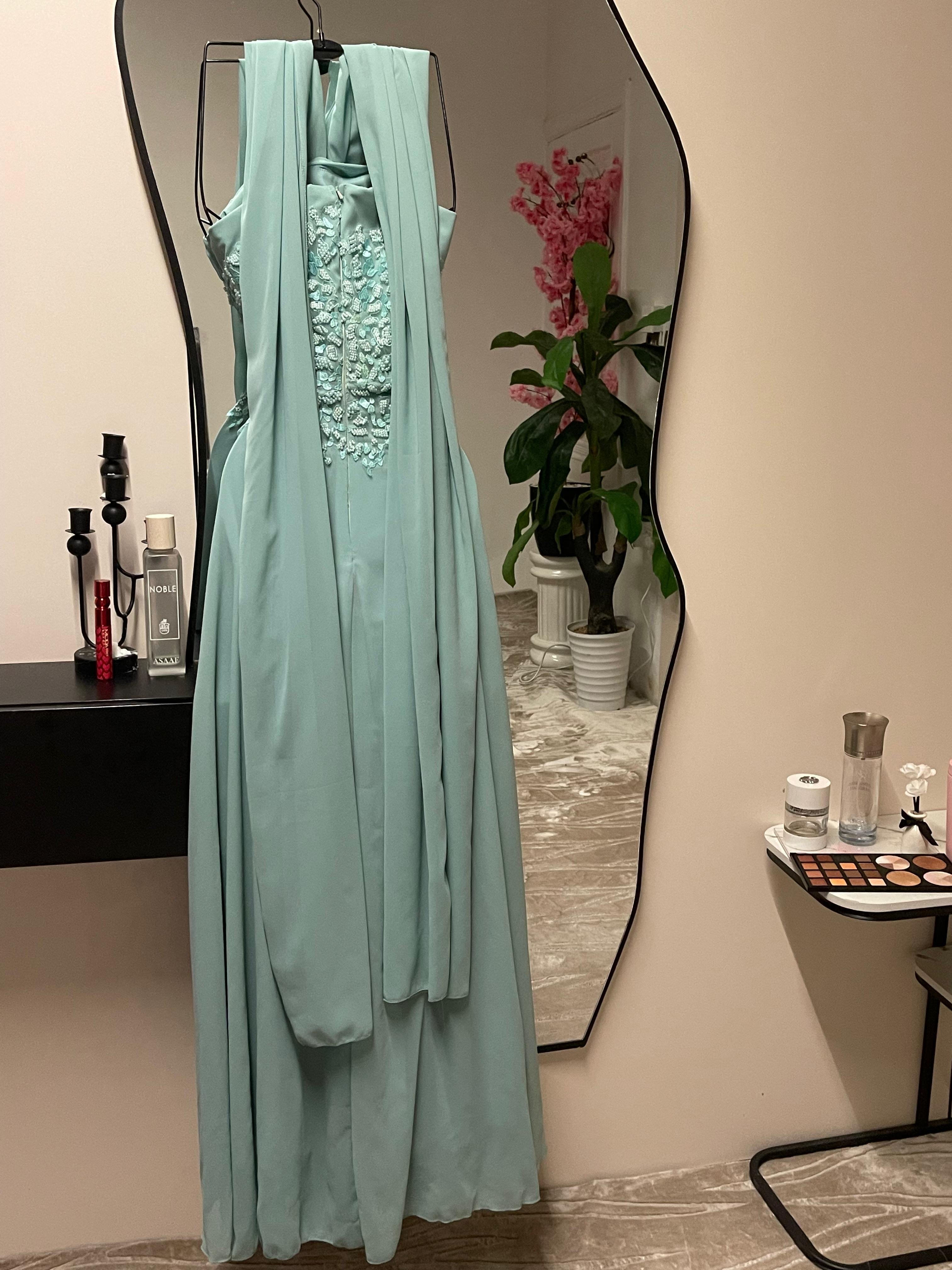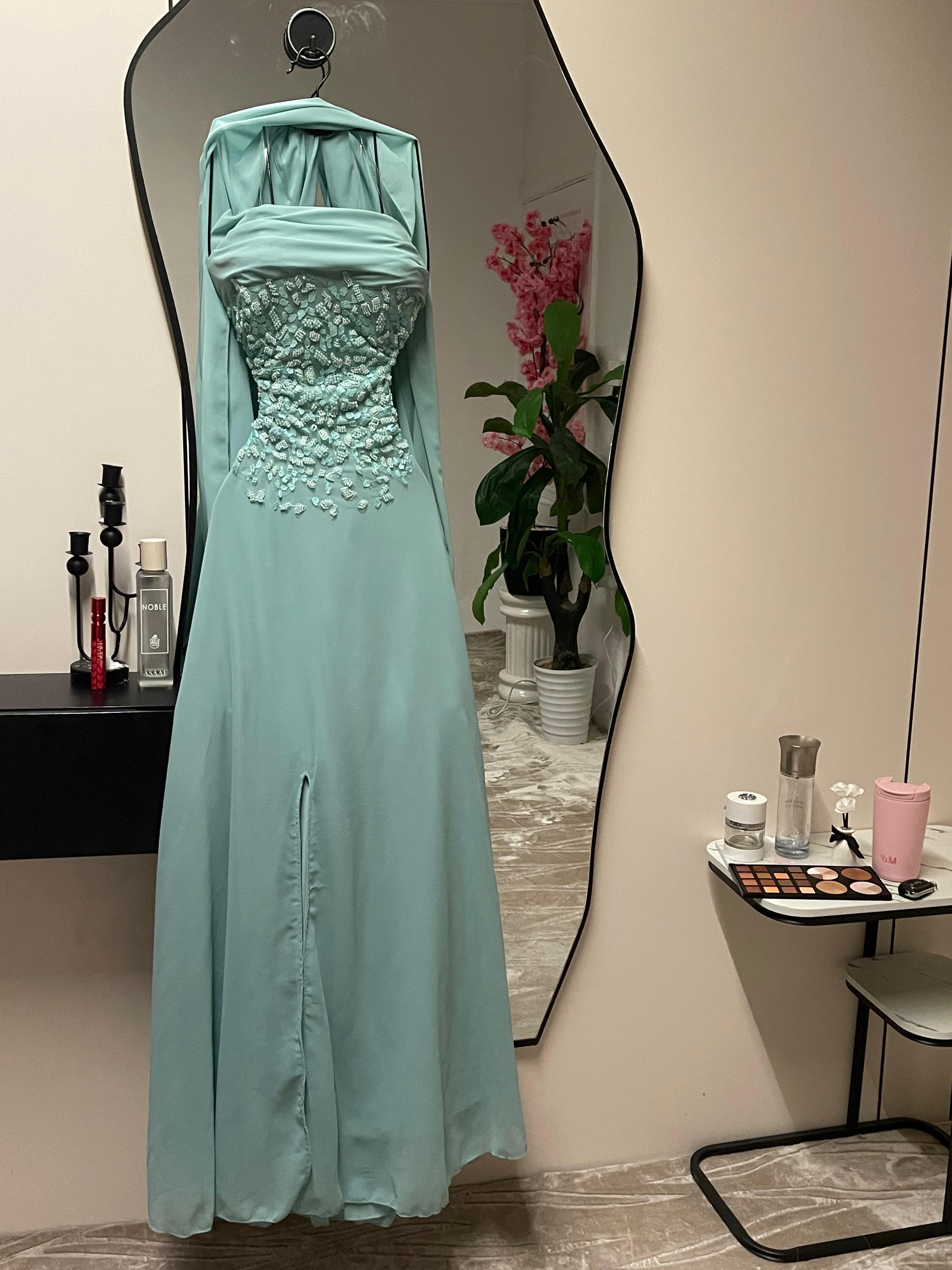 فستان سهرة أنثوي بلون أزرق سماوي يفيض نعومة وسحراً.