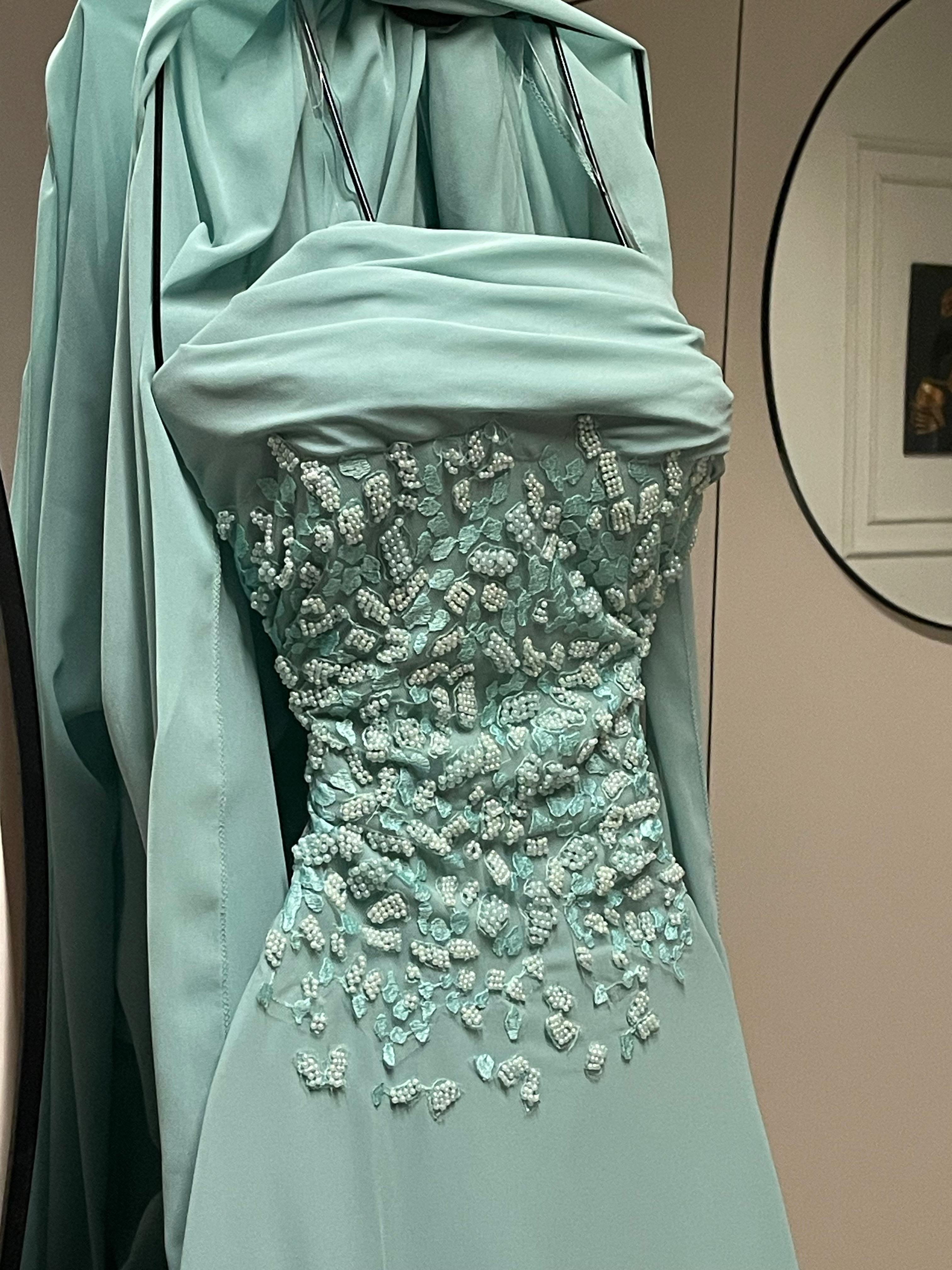 تزيّنه تطريزات يدوية بلون اللؤلؤ والأزرق الفاتح تضفي إشراقة راقية على منطقة الخصر والصدر.