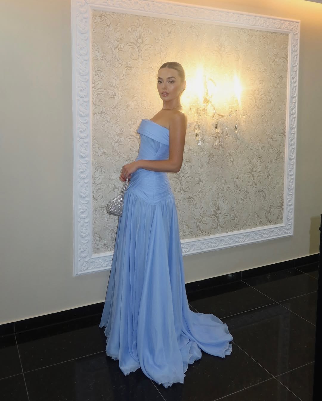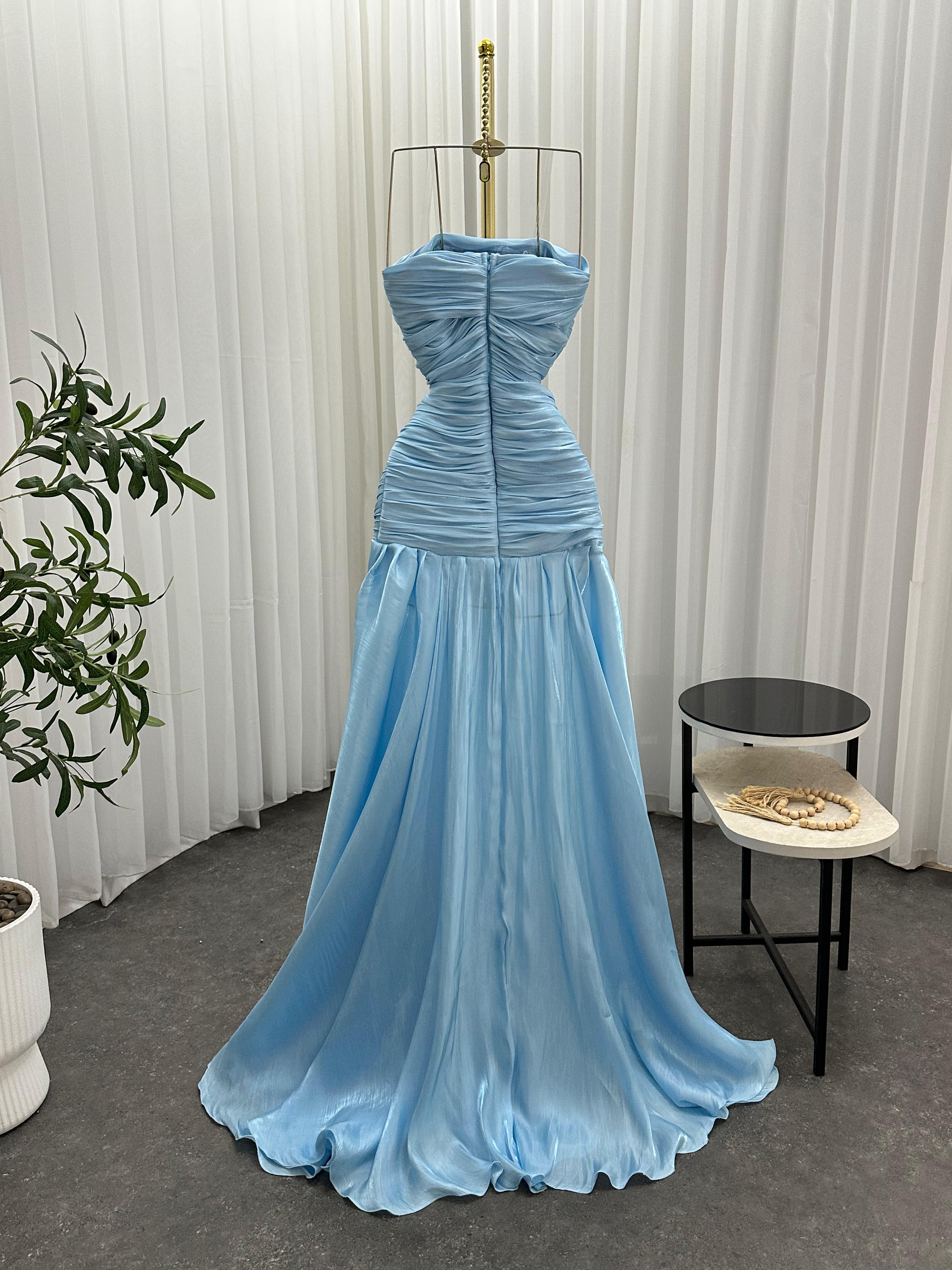 فستان سهرة فخم بلون أزرق سماوي ناعم، يجمع بين البساطة والرقي بتصميم سترابلس (بدون أكمام) مع درابيه أنيق يبرز جمال القصة. يتميز بقصة ضيقة عند الخصر لإبراز القوام الأنثوي بانسيابية تتدرج إلى تنورة واسعة بملمس حريري راقٍ، ليمنحك حضورًا ملكيًا في الحفلات، المناسبات الراقية أو الخطوبات.