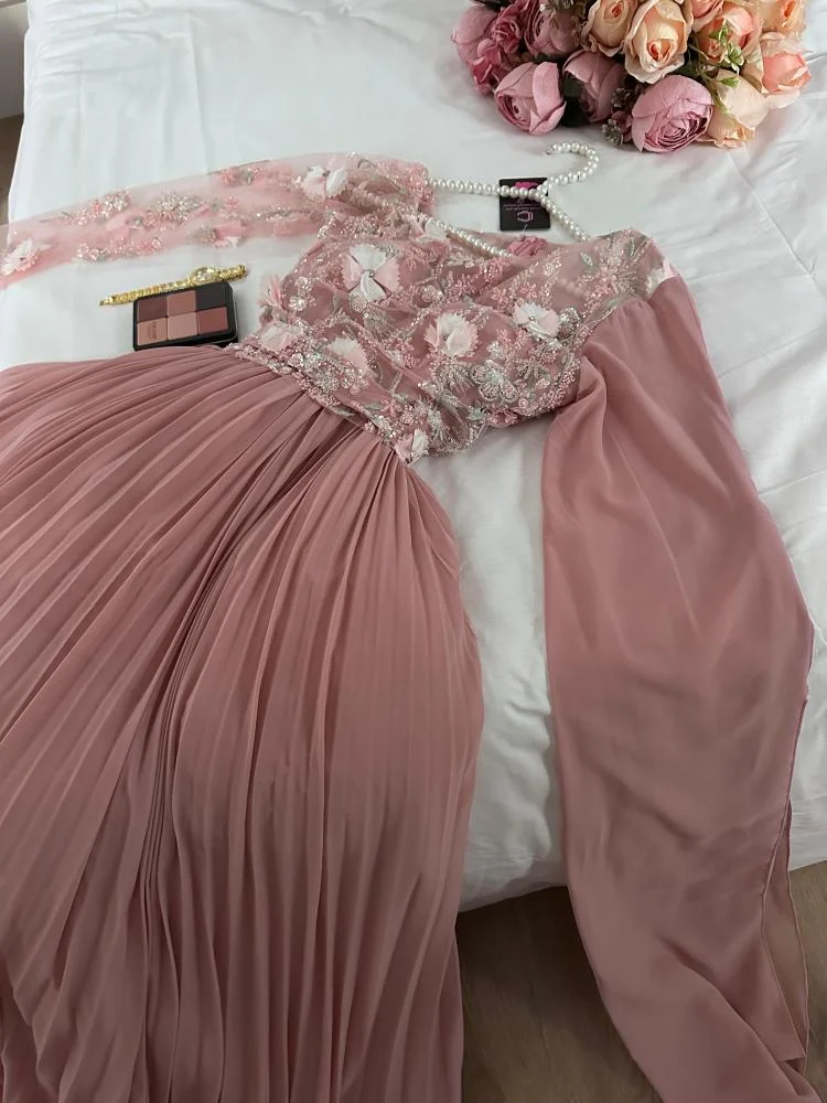 فستان سهرة باللون الوردي الفاتح يعكس الرقي والنعومة بإطلالة أنثوية ساحرة. يتميز بقصة أوف شولدر مع أكمام شفافة مطرزة بتفاصيل براقة تضيف لمسة فاخرة، وصدر مزخرف يبرز جمال التصميم. الخصر مرتفع مع تنورة واسعة من التول الناعم تنسدل بانسيابية، ما يمنح راحة وأناقة مثالية للمناسبات الخاصة والسهرات الراقية.