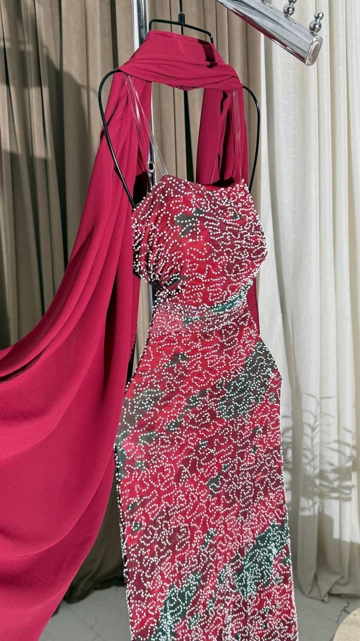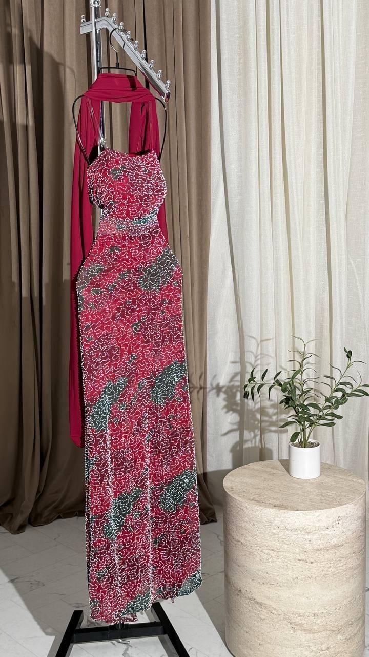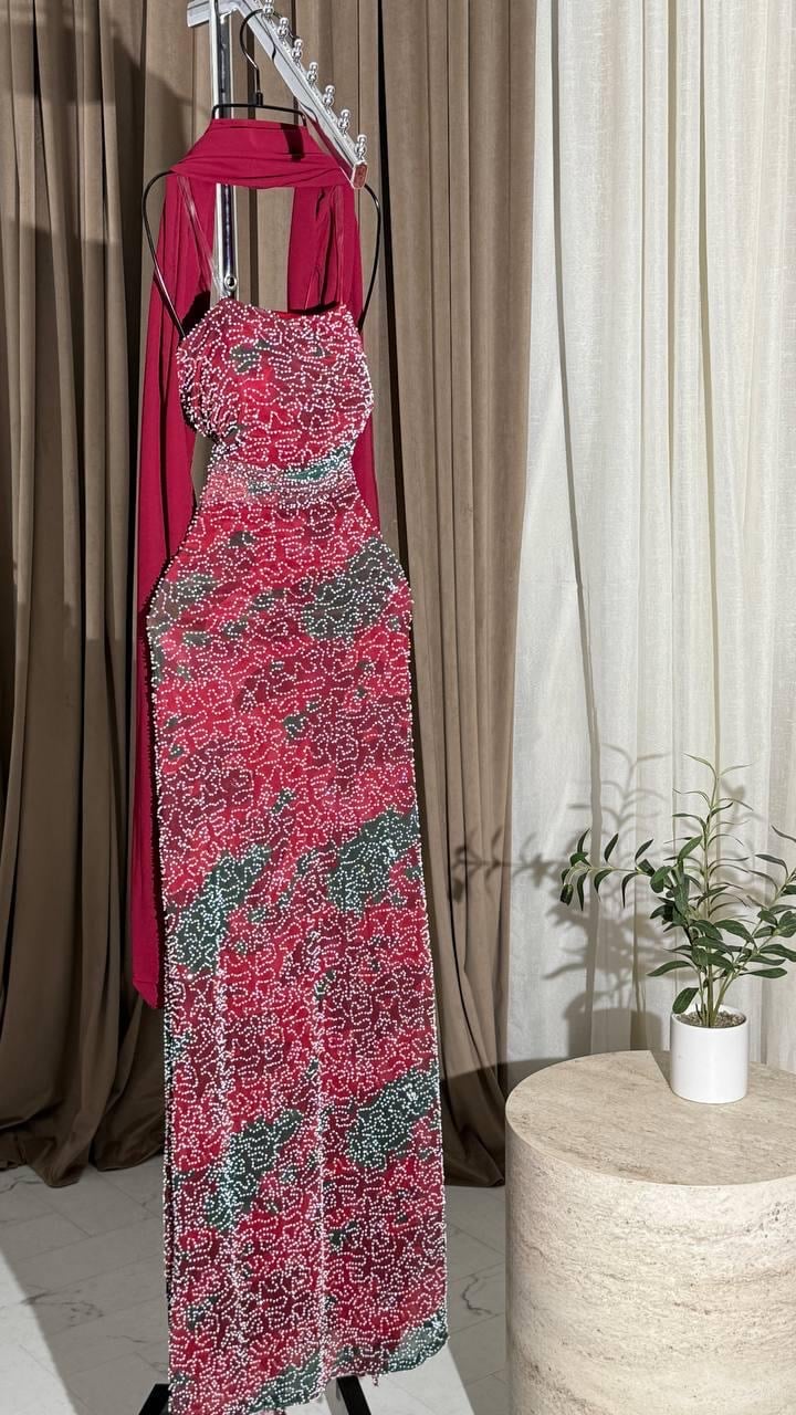 فستان سهرة فاخر بدون أكمام بتصميم ضيق يبرز القوام برشاقة وأناقة. يتميز بتطريز كامل بالترتر الملون البراق بدرجات البنفسجي والأخضر لتمنحك إطلالة جريئة ومبهرة. خيار مثالي للسهرات والمناسبات التي تتطلب حضوراً لافتاً وفخامة لا مثيل لها.