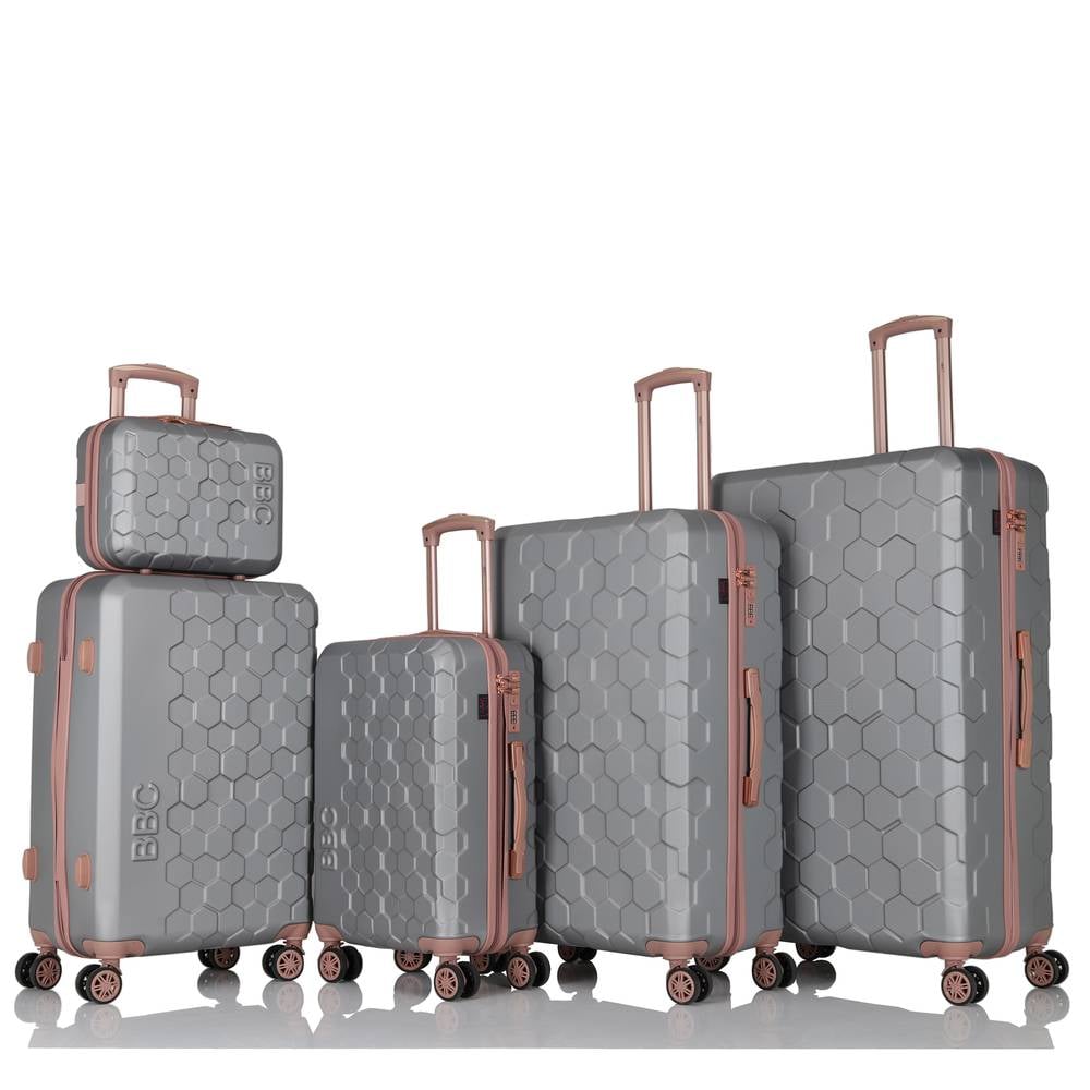 طقم شنط الدبش الرائع المكون من 5 قطع مصنوعة من خامة ABS(أكريلونيتريل بوتادين ستايرين) المعروفة بصلابتها وخفتها، والمصممة بعناية لتناسب ذوق العرائس والمسافرين الباحثين عن الجودة والتميّز.