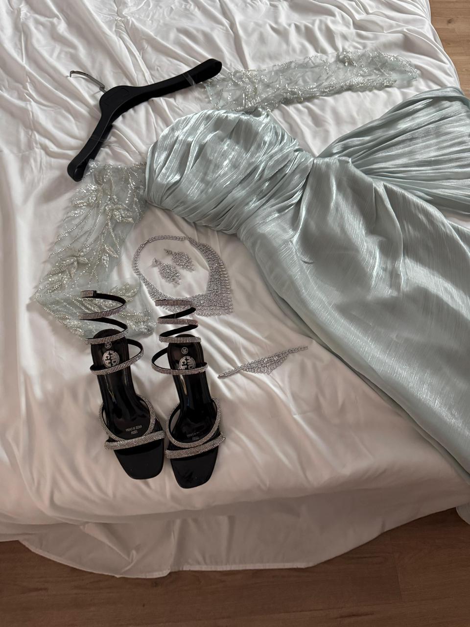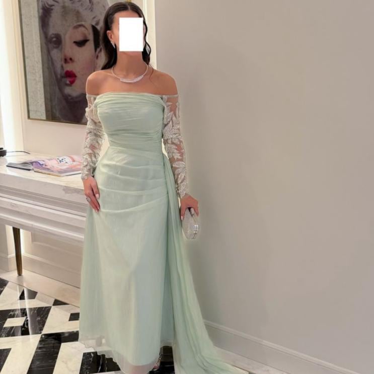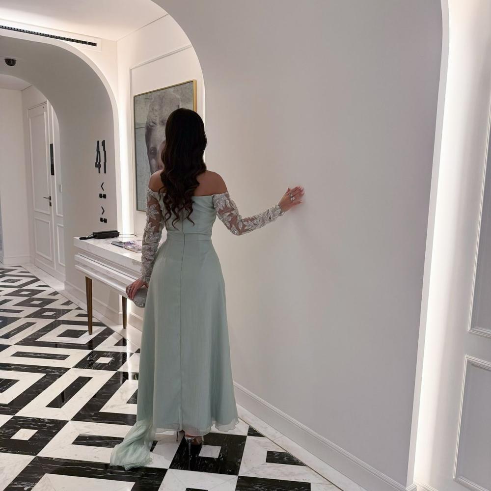 فستان تيفاني يعانقك بأنوثة ناعمة، وتطريزات زهرية تلمع كضوء الصباح. تصميم ساحر ينطق بالذوق الرفيع فستان سهرة أنيق بلون تيفاني الآسر، بتصميم أنثوي يجمع بين النعومة والتميز. يتميز بقصة مكشوفة الأكتاف (أوف شولدر) تبرز جمال الرقبة والكتفين، مع أكمام طويلة من التول الشفاف المزين بتطريزات زهرية فاخرة تضفي لمسة ساحرة.