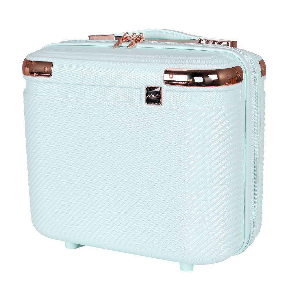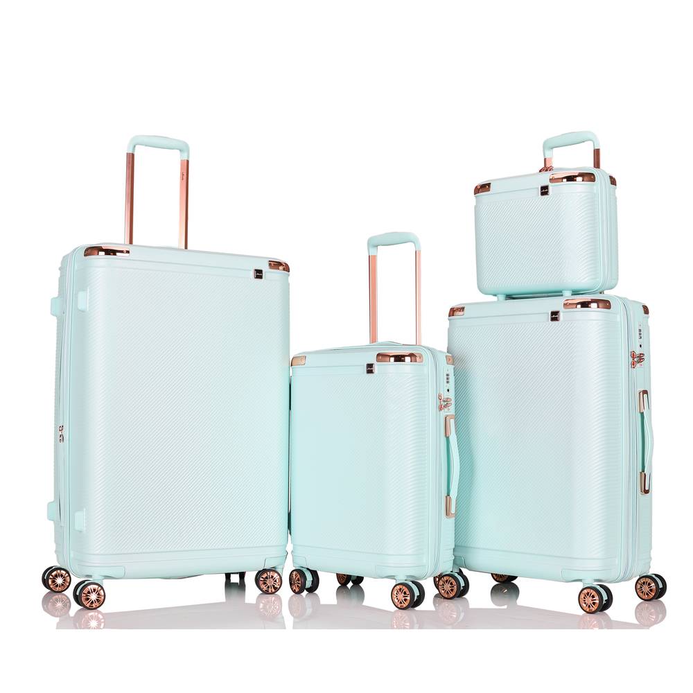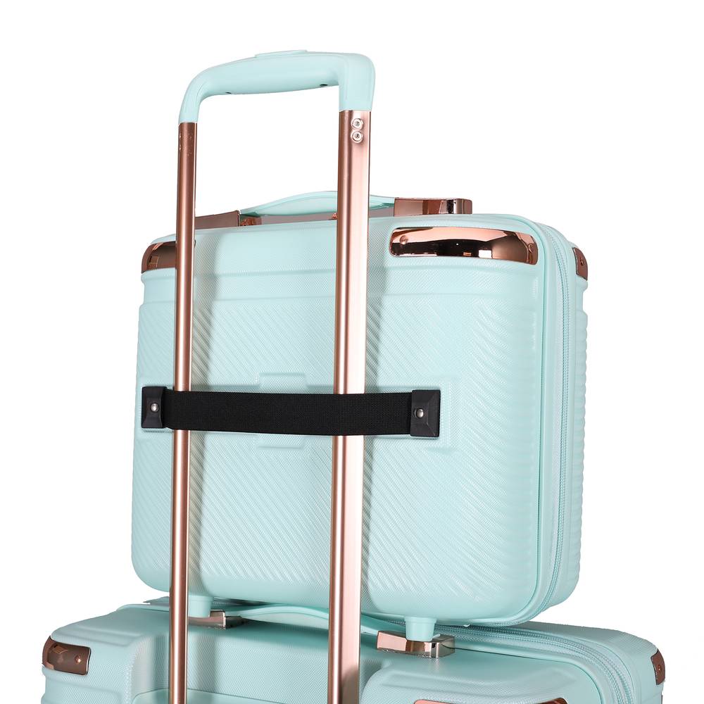 سافري بأناقة وراحة مع هذا الطقم المميز من شنط السفر باللون التركواز الفاتح مع لمسات ذهبية روز تضيف لمسة فاخرة. يتكون الطقم من 4 قطع عملية: حقيبة كبيرة، حقيبة متوسطة، حقيبة صغيرة، وحقيبة يد صلبة يمكن استخدامها كصندوق تجميلي أو حقيبة كابينة.