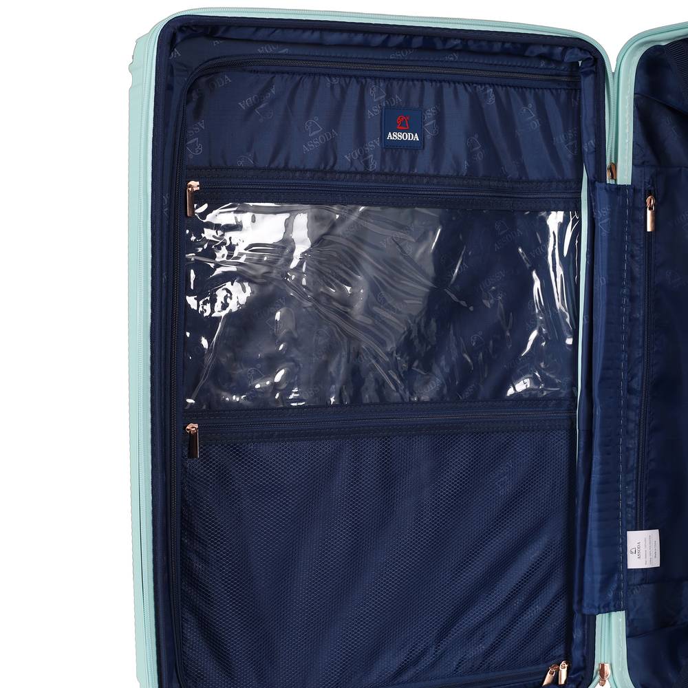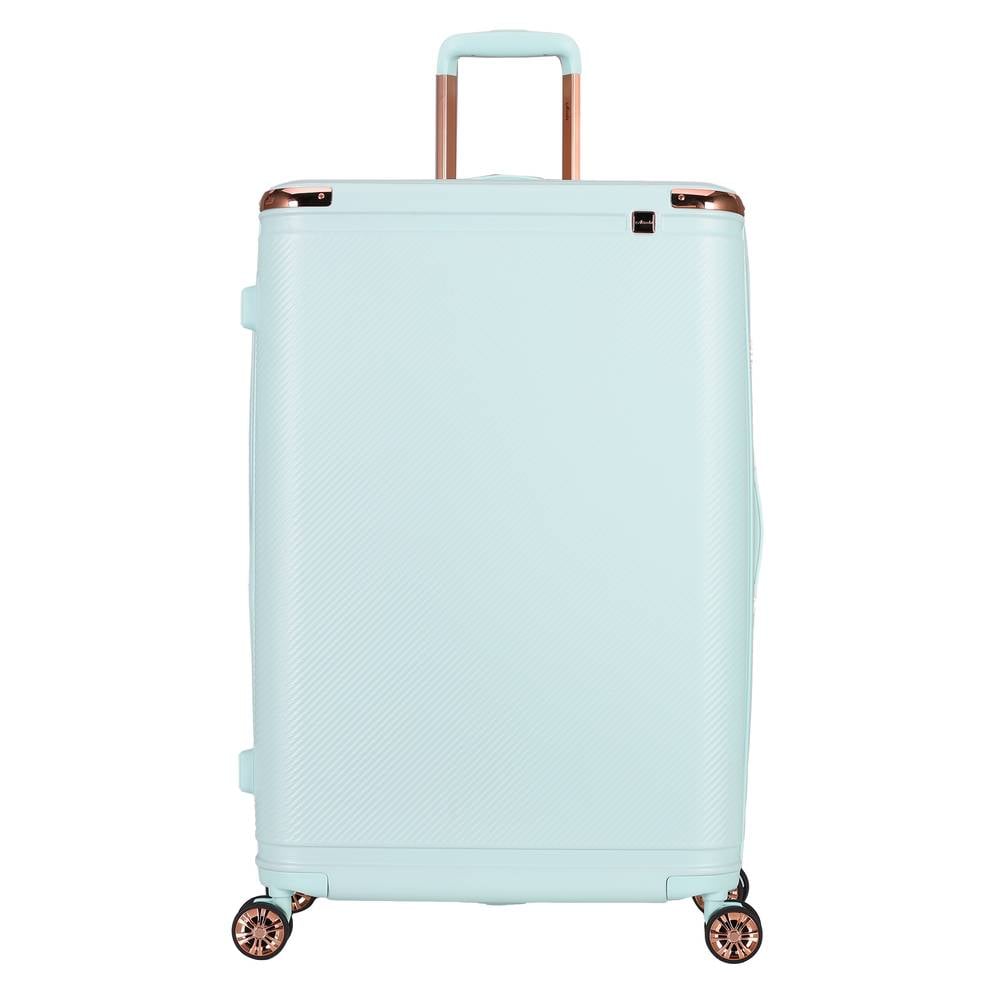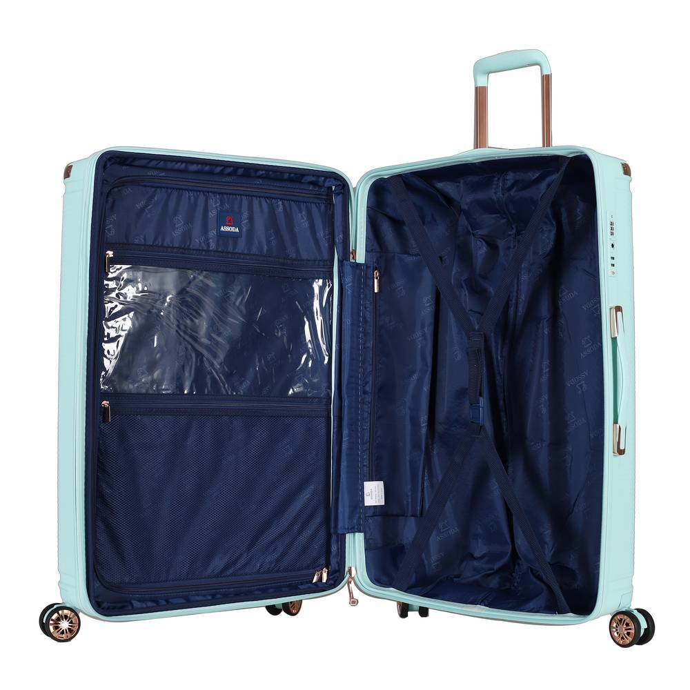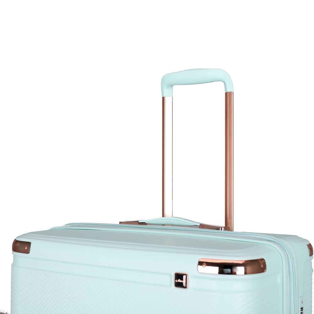 سافري بأناقة وراحة مع هذا الطقم المميز من شنط السفر باللون التركواز الفاتح مع لمسات ذهبية روز تضيف لمسة فاخرة. يتكون الطقم من 4 قطع عملية: حقيبة كبيرة، حقيبة متوسطة، حقيبة صغيرة، وحقيبة يد صلبة يمكن استخدامها كصندوق تجميلي أو حقيبة كابينة.