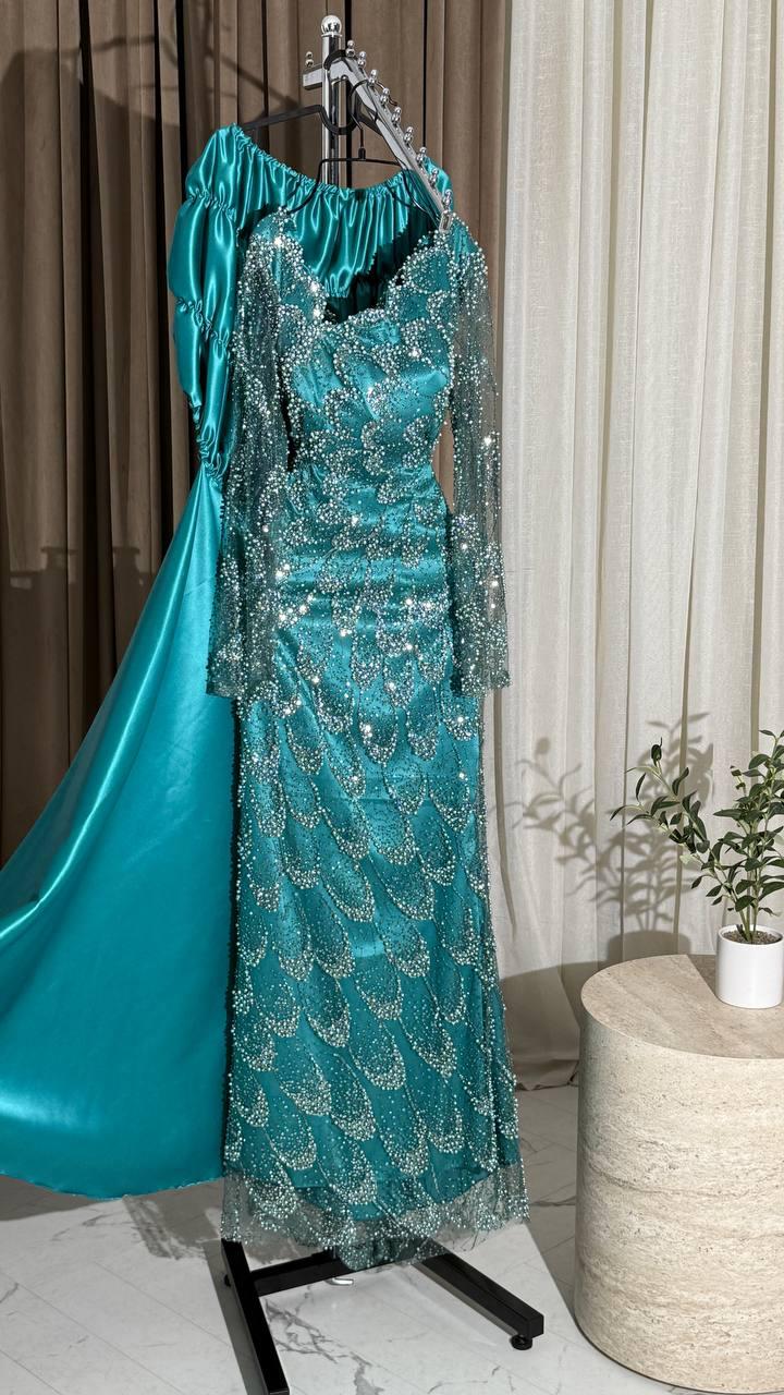 تألقي بإطلالة استثنائية مع هذا الفستان الفيروزي الساحر. تصميم مطرز بالكامل بلمسات ترتر لامعة تمنحك إشراقة أنثوية راقية، مع أكمام منفوخة ملكية تضيف بعداً دراميّاً ساحراً. الفستان مثالي للأمسيات الفاخرة وحفلات الزفاف والمناسبات المميزة حيث يلتقي الذوق الرفيع مع الفخامة.