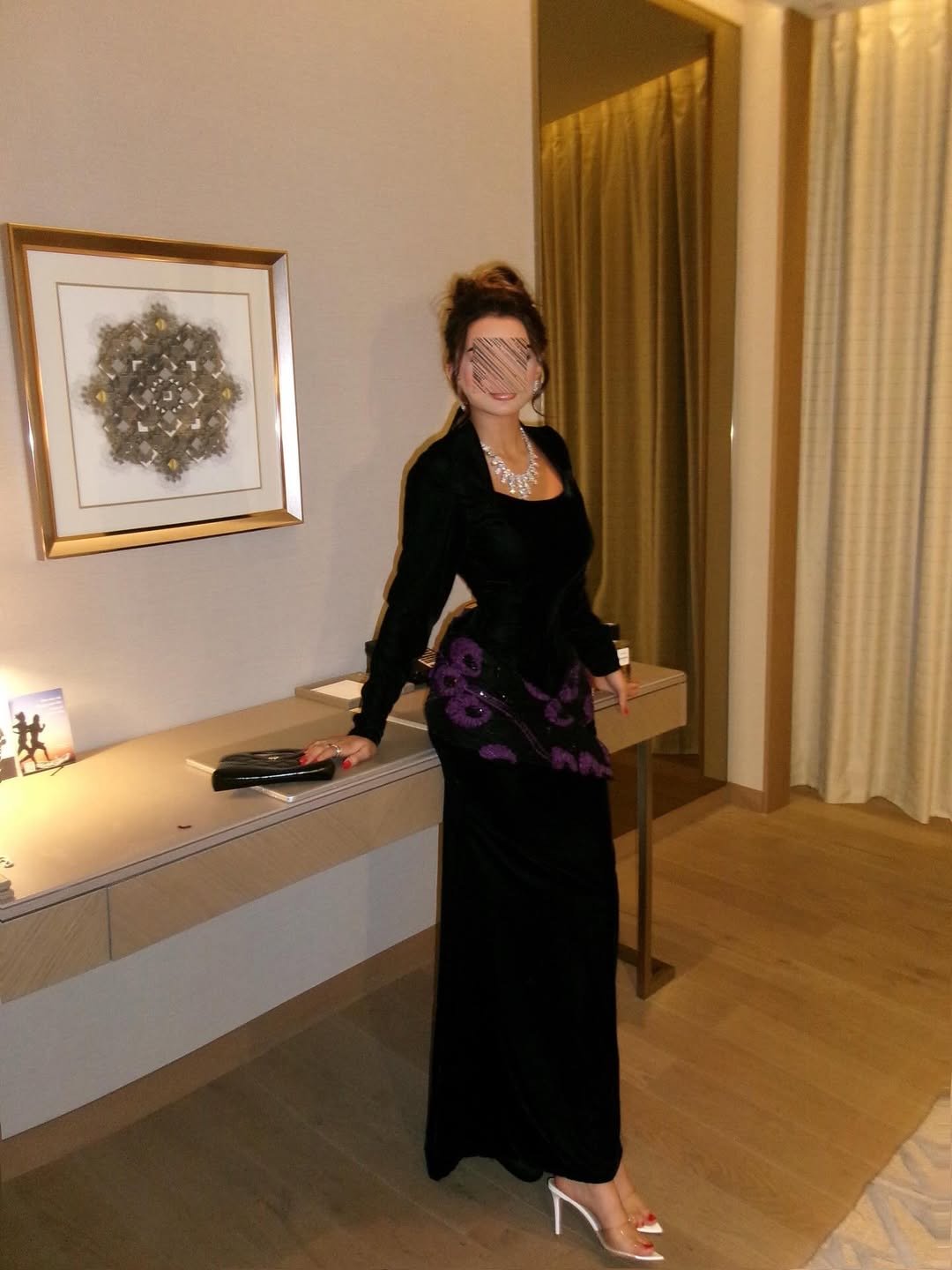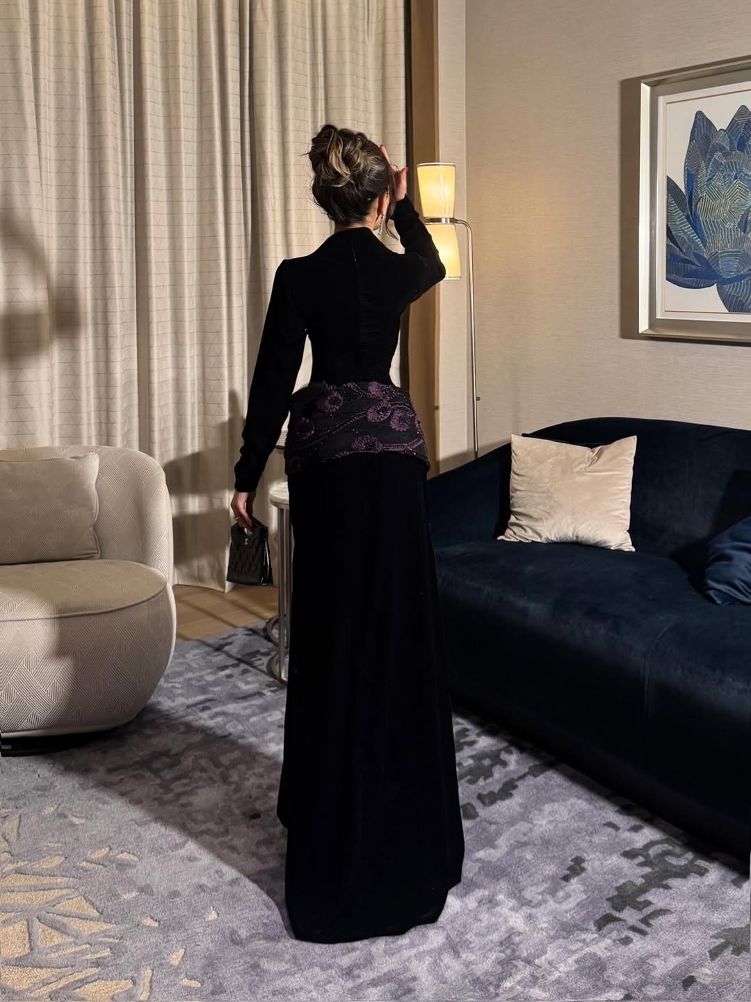 فستان أسود مخملي فاخر بتفاصيل بنفسجية لافتة تضيف لمسة من الغموض والجاذبية الملكية.