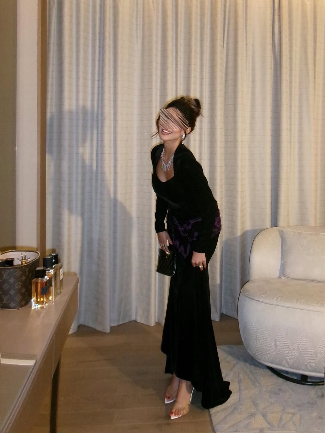 ينسّق مع حقيبة كلاتش سوداء أو فضيّة، وكعب عالٍ معدني أو شفاف لإطلالة متوازنة بين الرقيّ والجرأة.