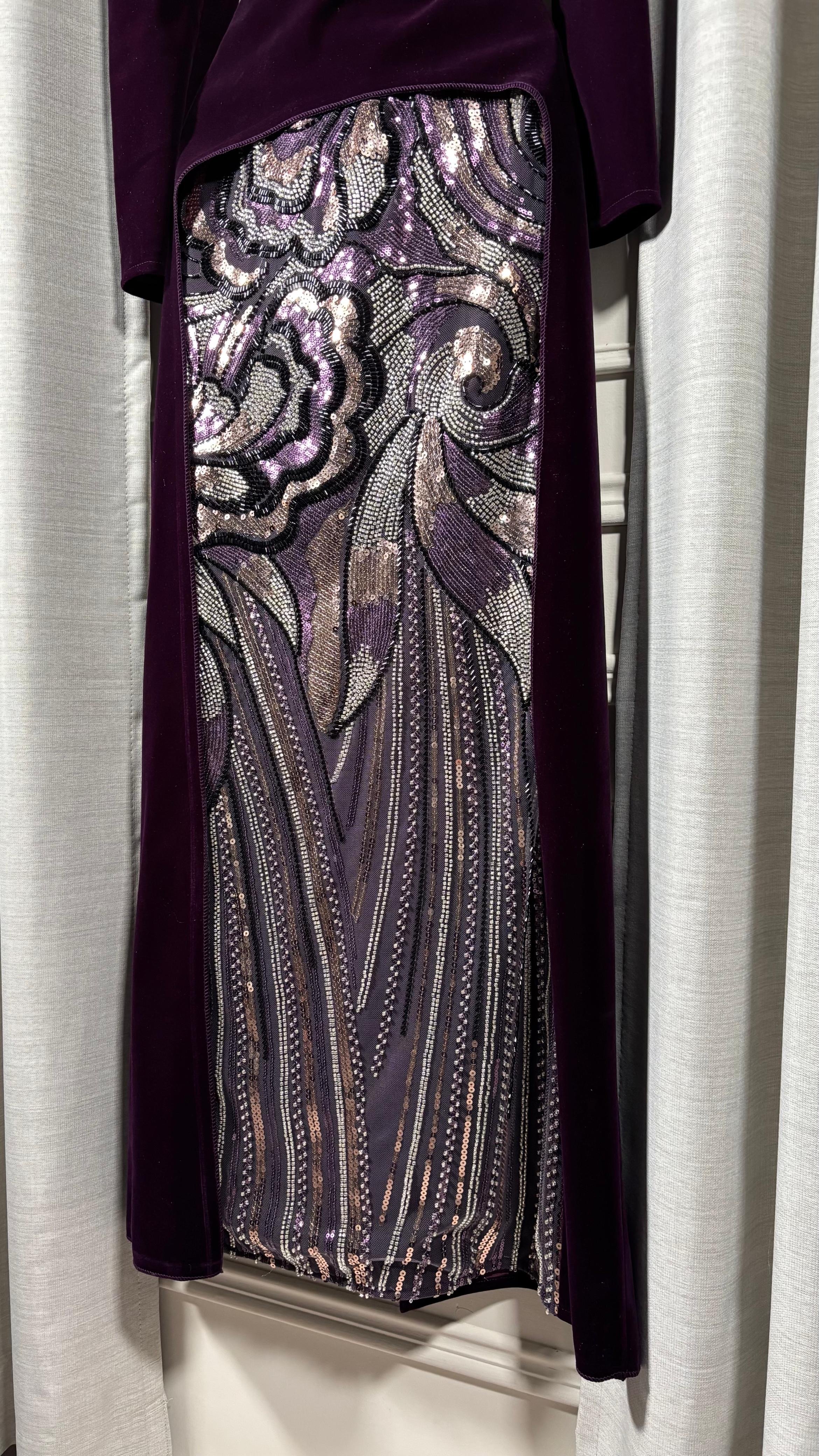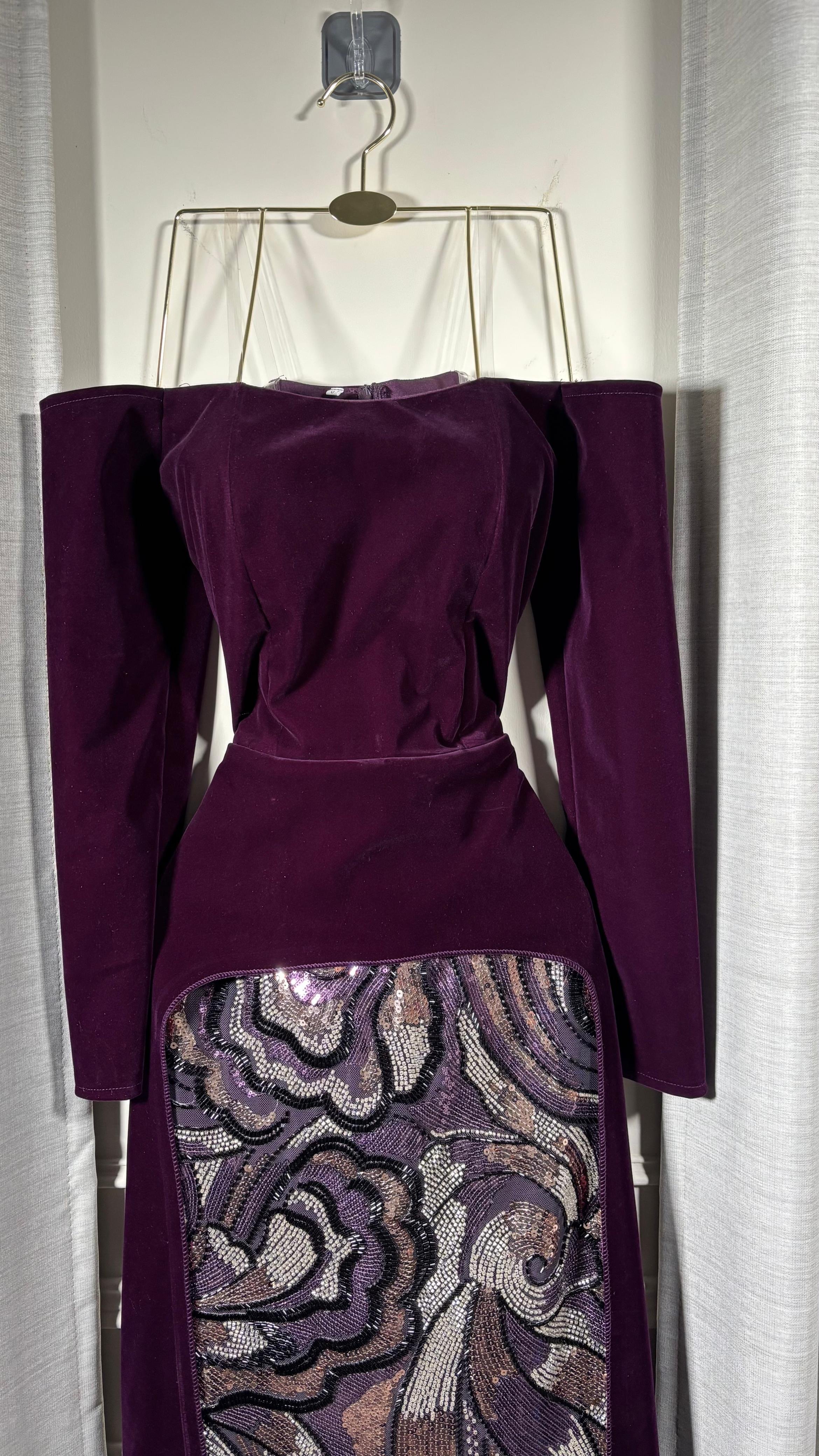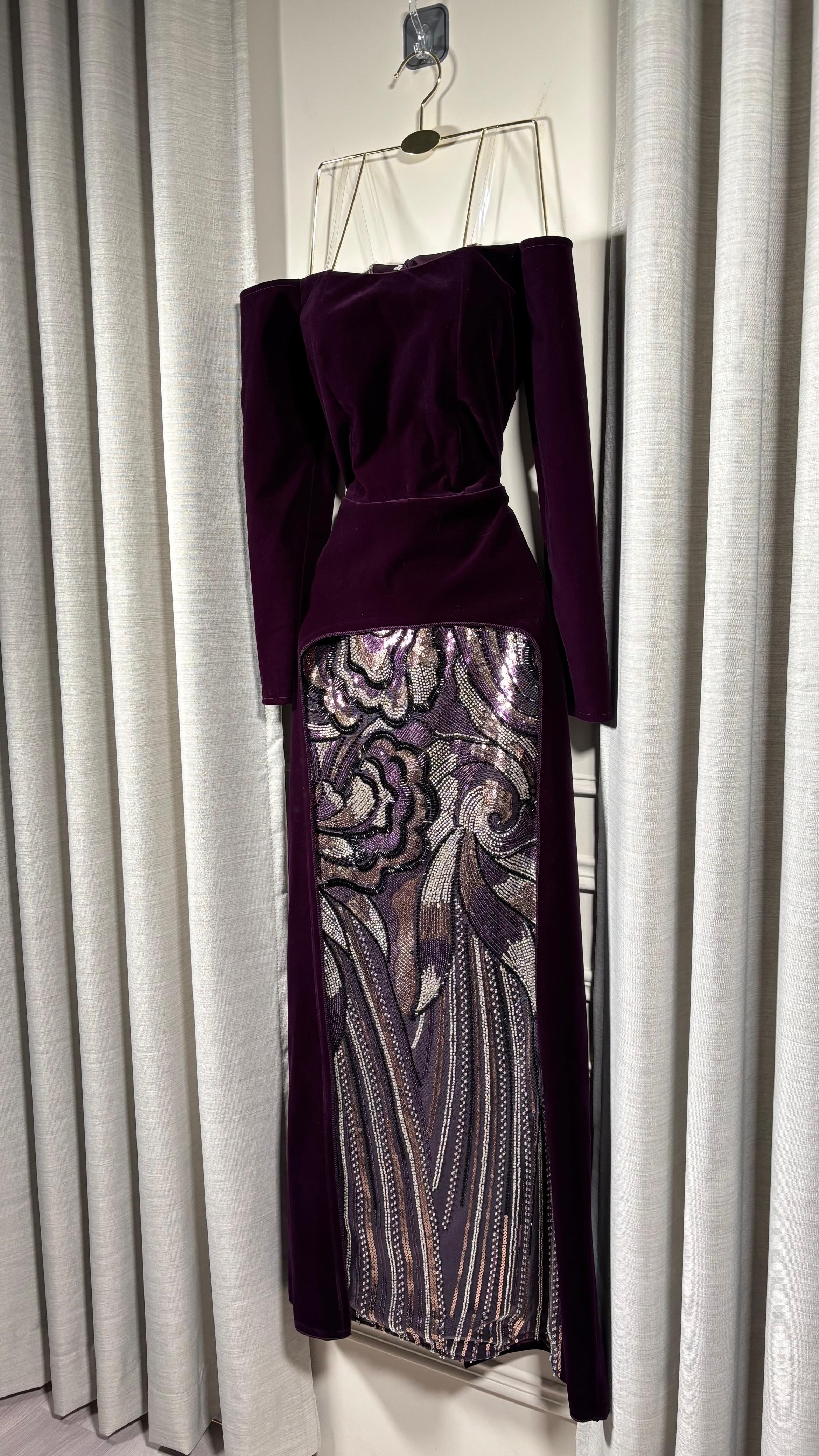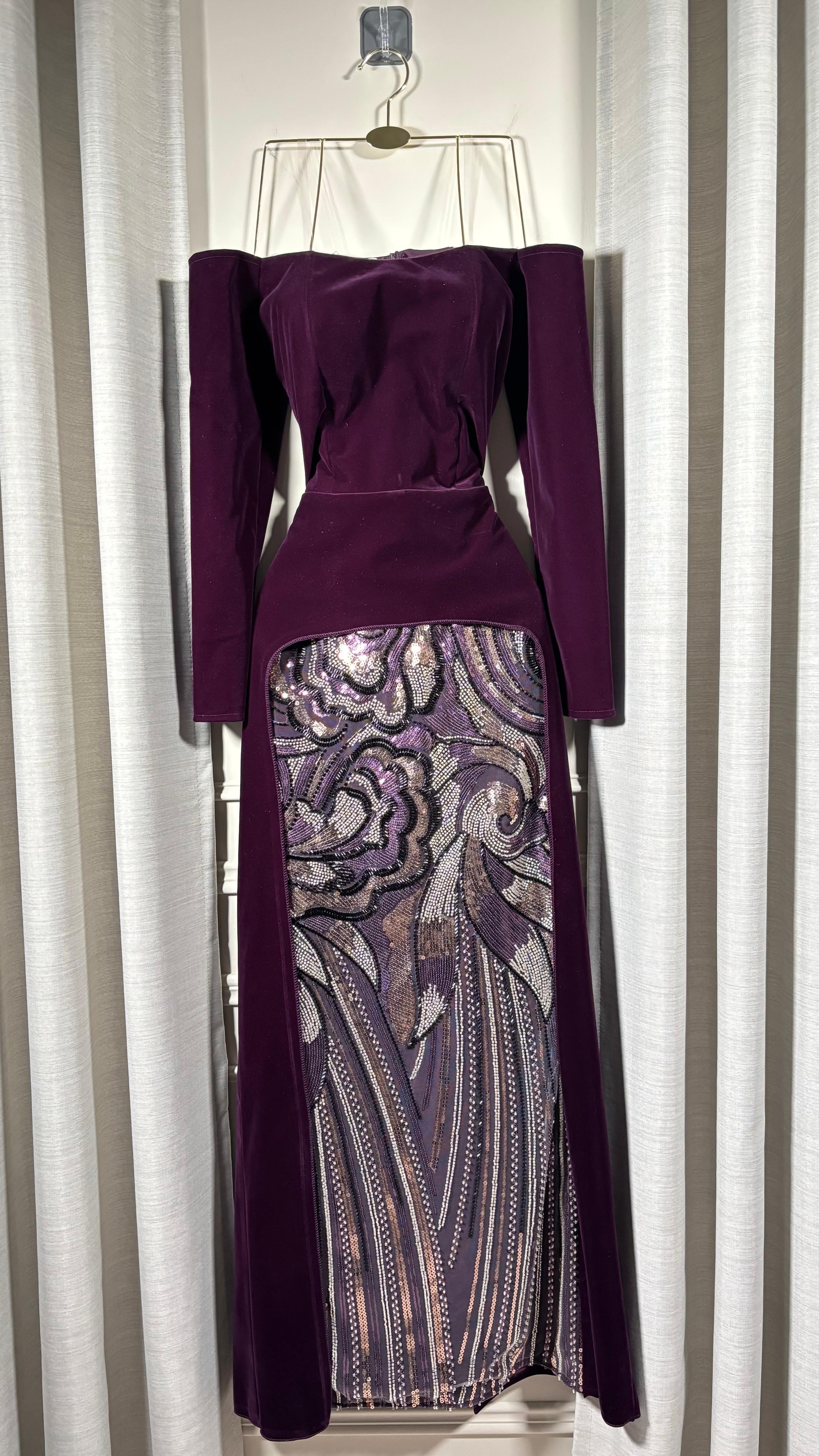 فستان موف بدرجة عميقة تعطي حضور هادئ وفخم.