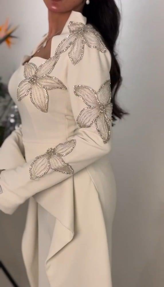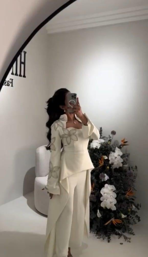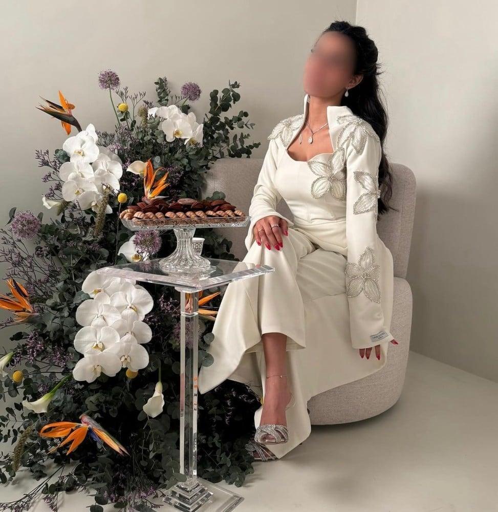 هذا الفستان الأبيض الساحر يجمع بين الأناقة والرقي بأسلوب عصري فاخر. يتميز بتصميمه المحتشم والمميز مع ياقة أنيقة وأكمام طويلة تضيف لمسة من الهيبة والفخامة. يزدان التطريز اليدوي الفاخر على الأكتاف والجزء العلوي بزهور متقنة التصميم بخيوط لامعة فضية، مما يمنحك حضورًا راقيًا يخطف الأنظار.