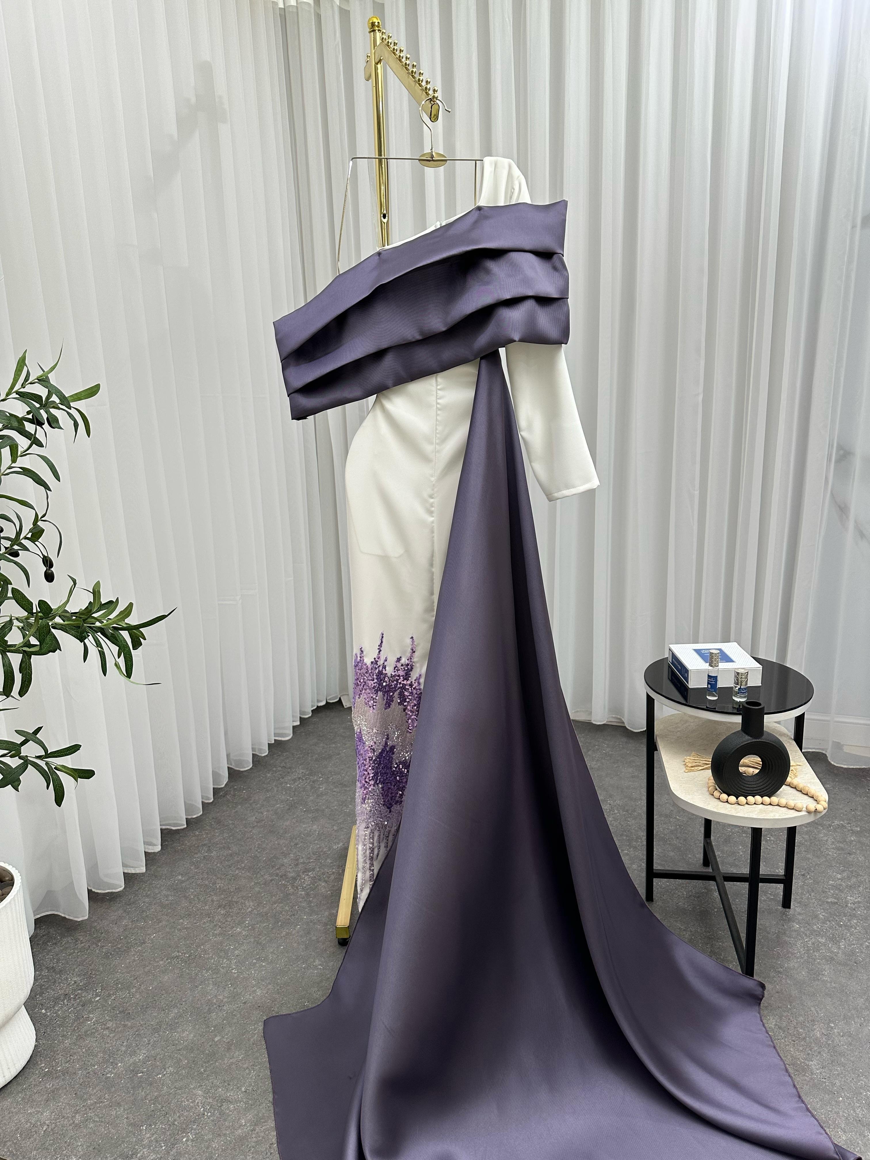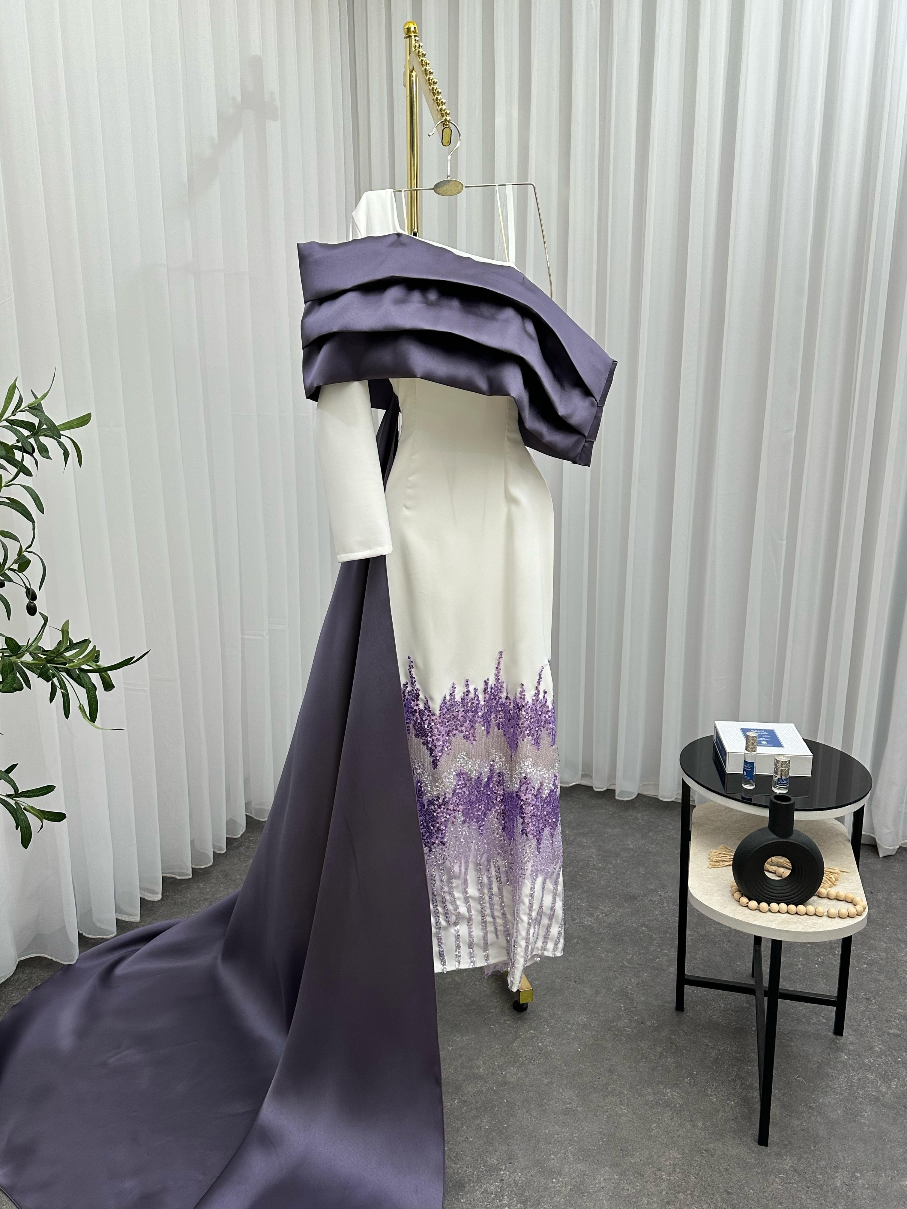 فستان سهرة أبيض وأرجواني بذيل ملكي وتطريز لامع