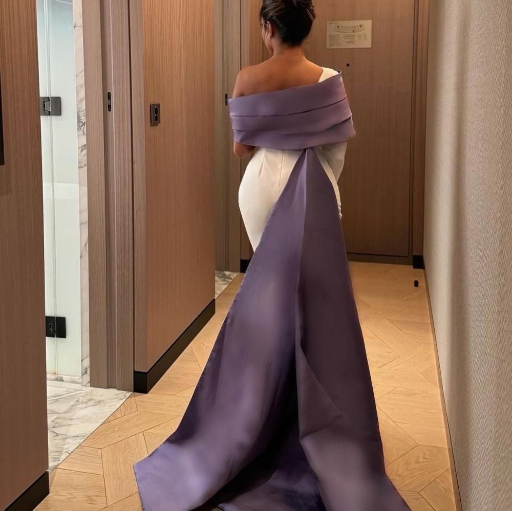 الصدر مصمم بأسلوب “أوف شولدر” مميز ومزخرف بطبقات من الساتان الأرجواني الحريري التي تلتف بانسيابية ناعمة على الكتف، وتستمر بذيل ملكي فاخر ينحدر من الخلف ليضفي فخامة لا مثيل لها. الفستان مثالي لحفلات الزفاف، الخطوبة، أو السهرات الراقية.