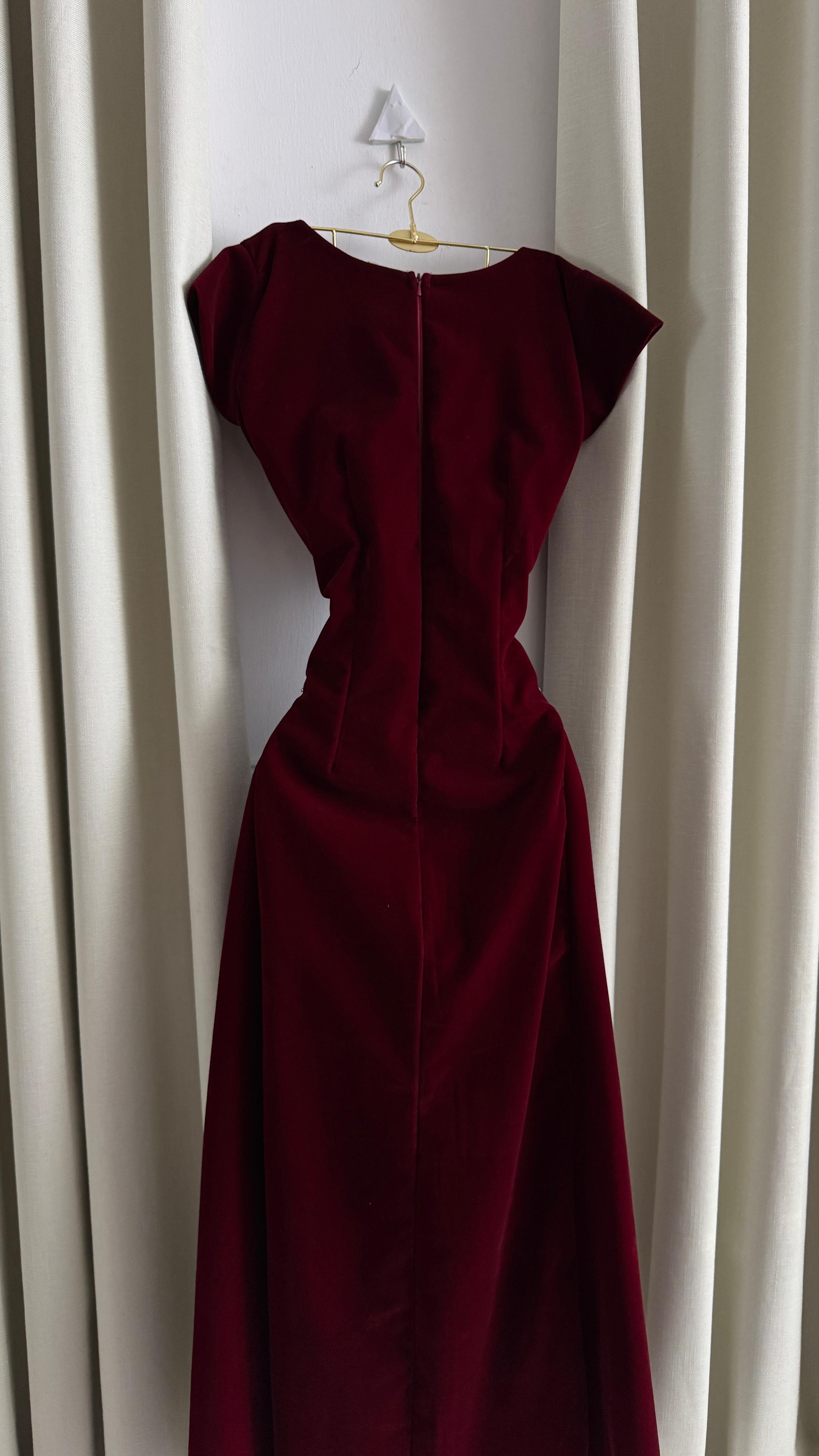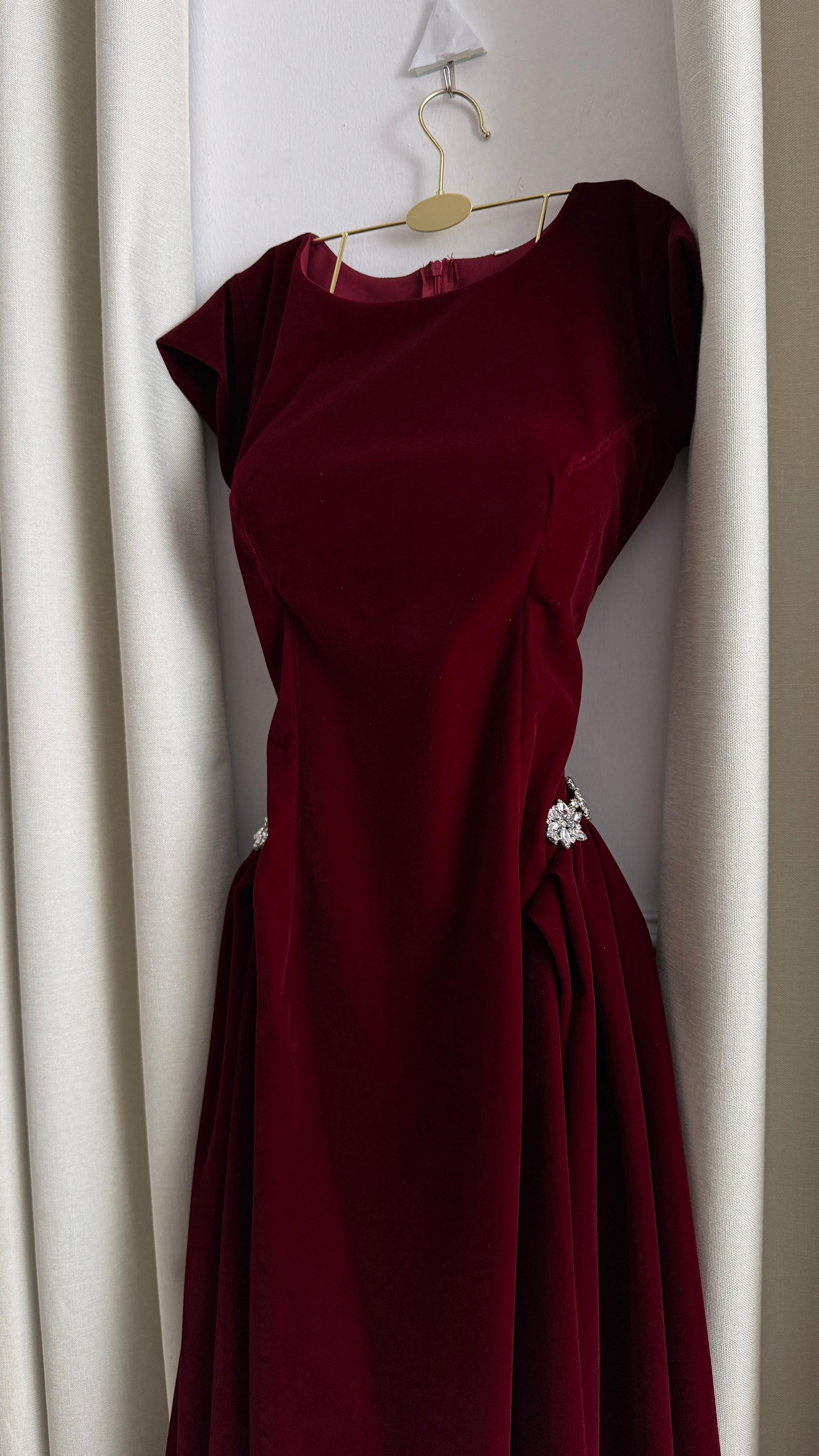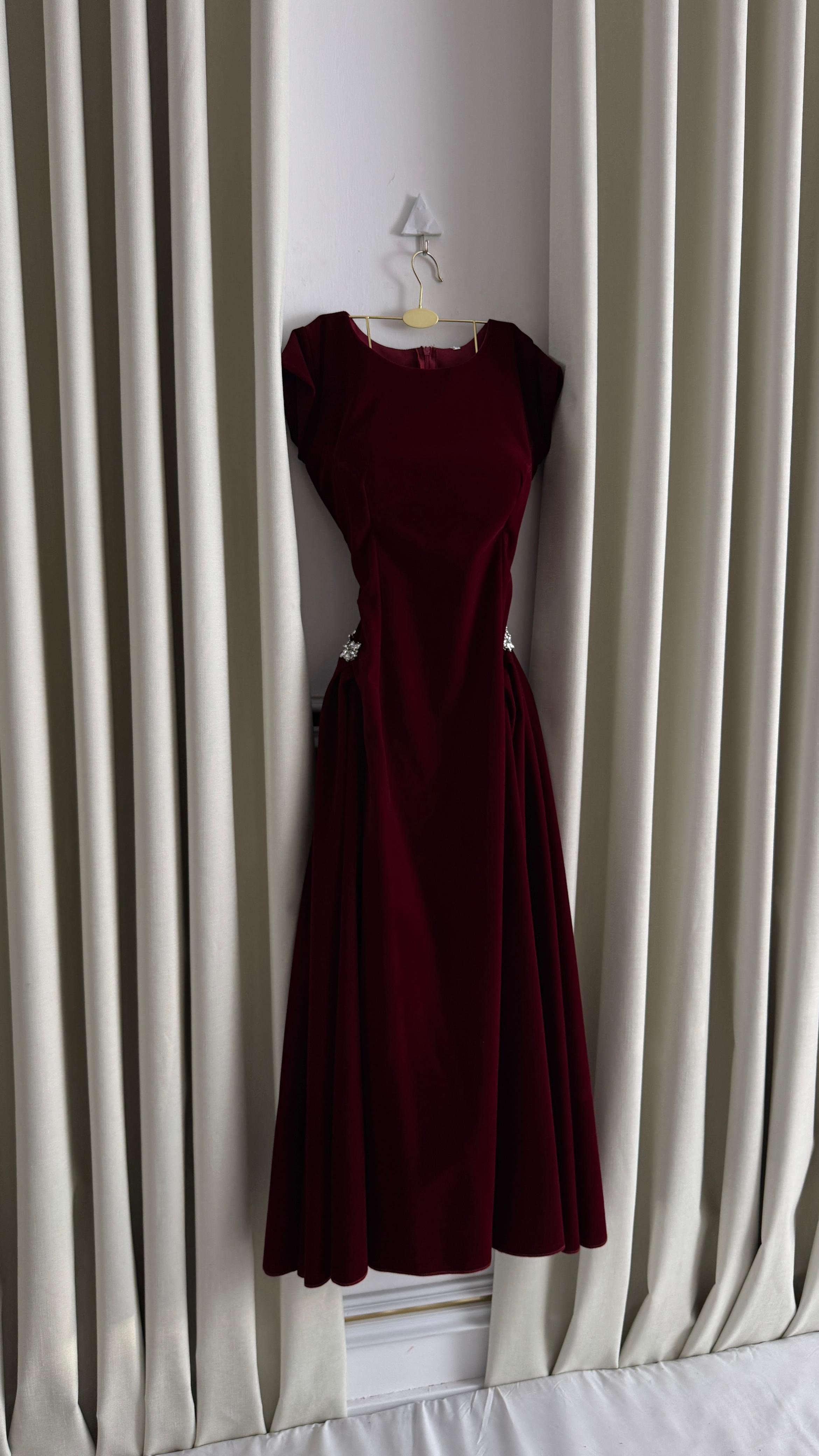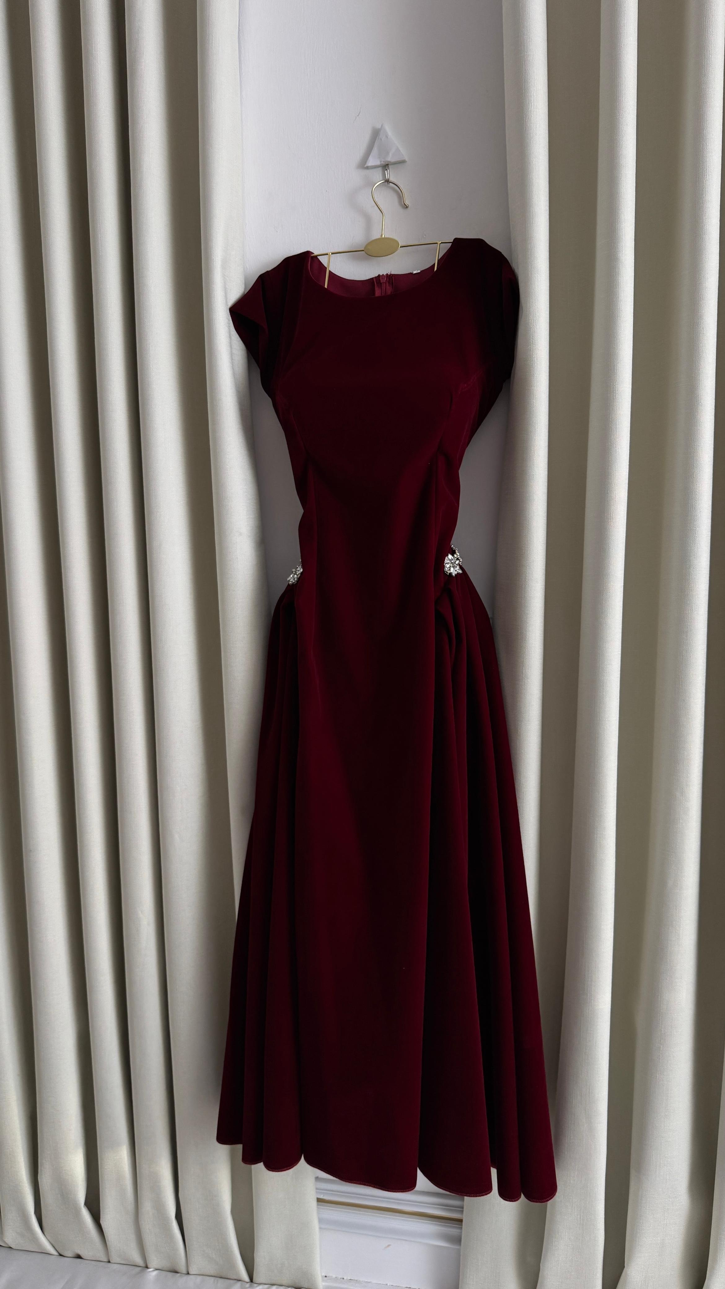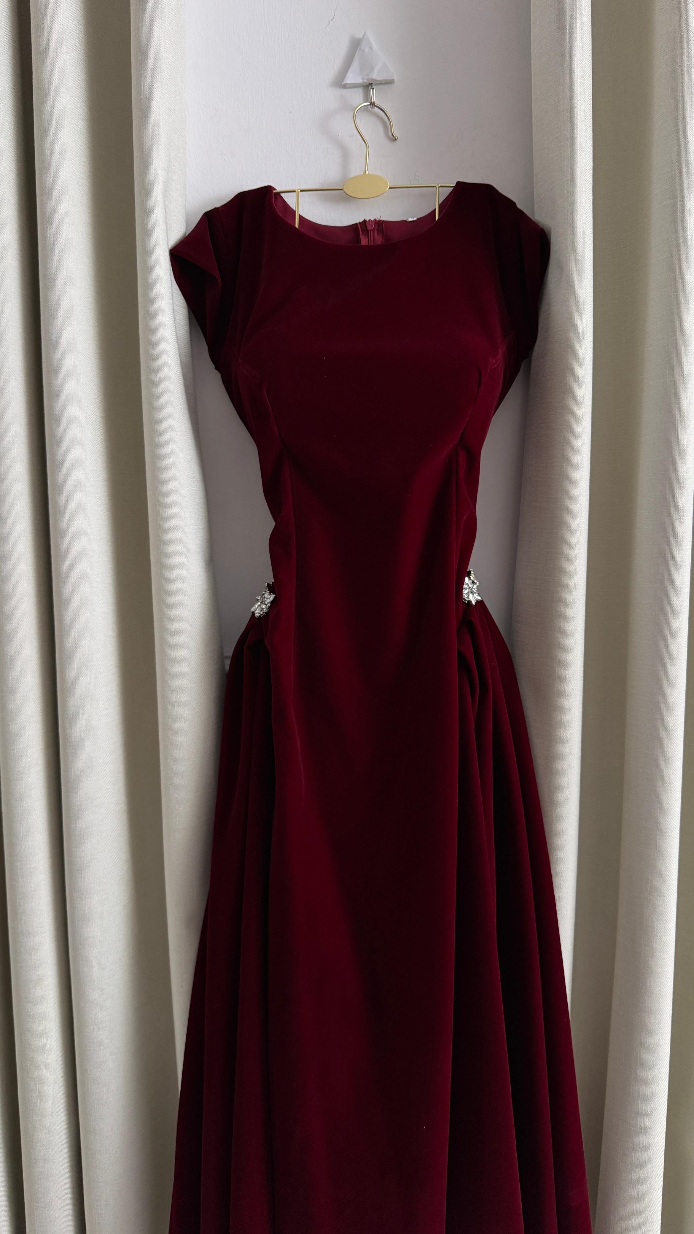 فستان سهرة فاخر باللون النبيذي العميق من قماش المخمل الفخم، بتصميم كلاسيكي أنيق يجمع بين البساطة والفخامة. يتميز بقصة ضيقة عند الخصر مع تنورة واسعة تعطي انسيابية جذابة، إضافة إلى لمسات تطريز جانبية بالكريستال تضفي إشراقة راقية. مثالي للسهرات الراقية والمناسبات الخاصة.