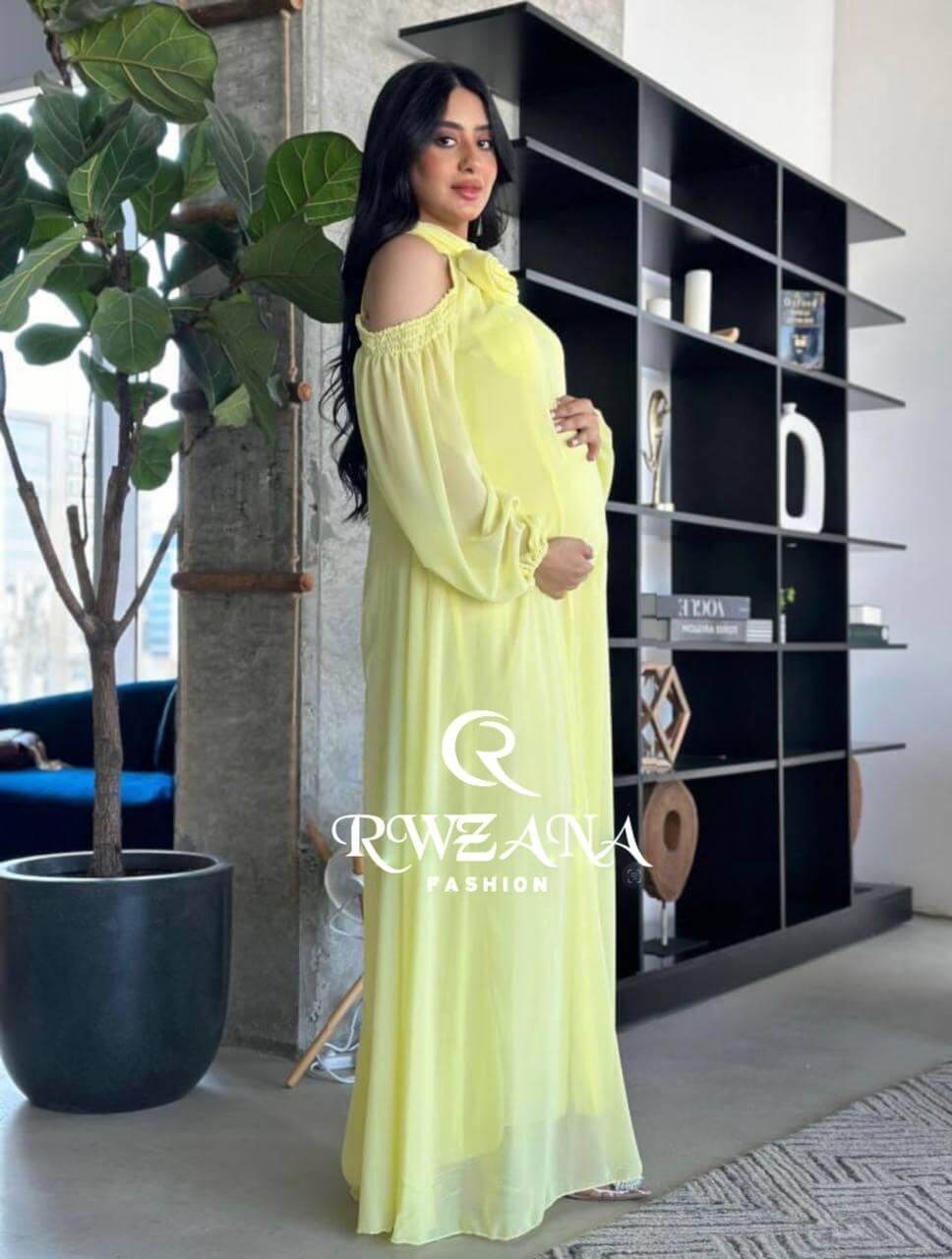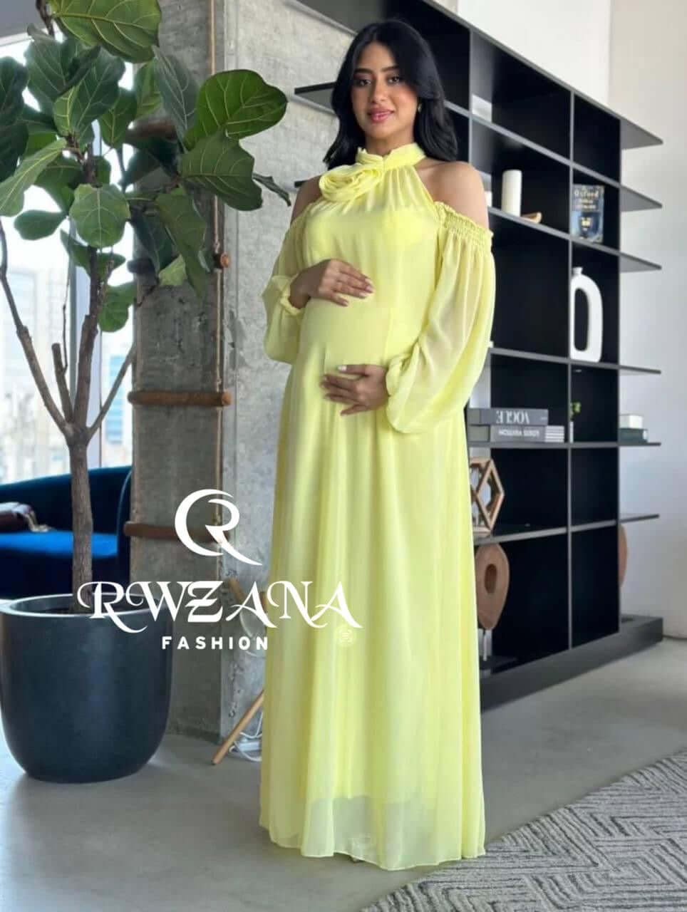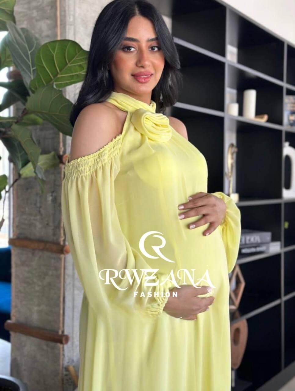 فستان فاخر من الشيفون الأصفر بتصميم فضفاض يمنح راحة وأناقة، مزين بتطريز فضي على الياقة وأزرار لامعة على الأكمام، يمنحك حضورًا مشرقًا وجاذبية خاصة، ومناسب أيضًا للحوامل بفضل قصته المريحة.
