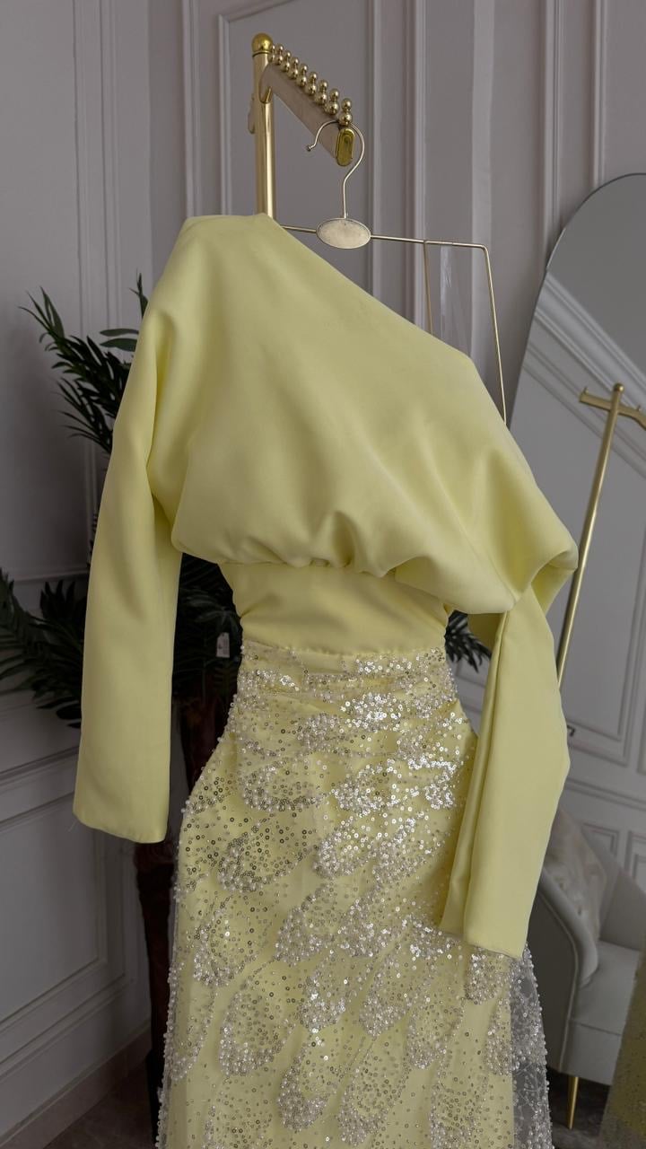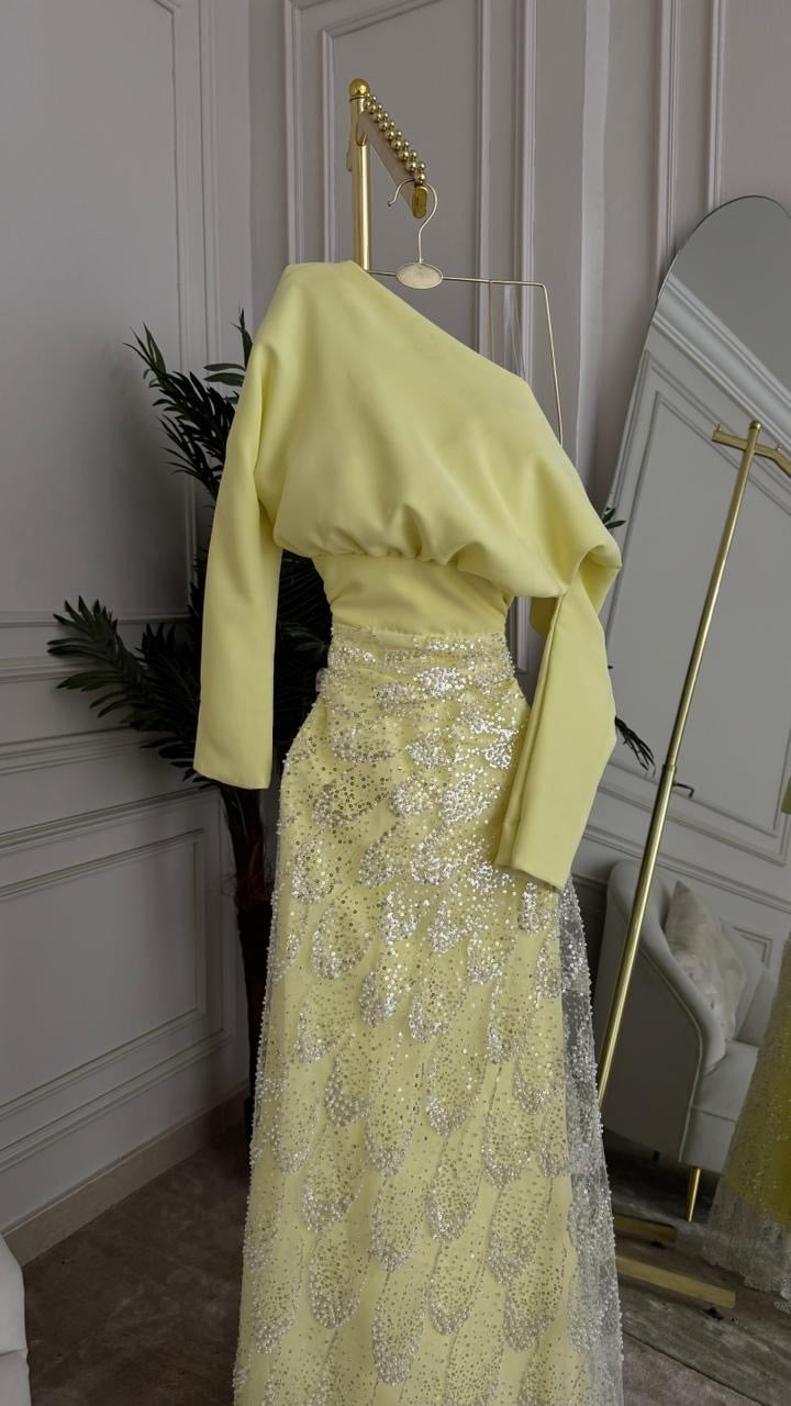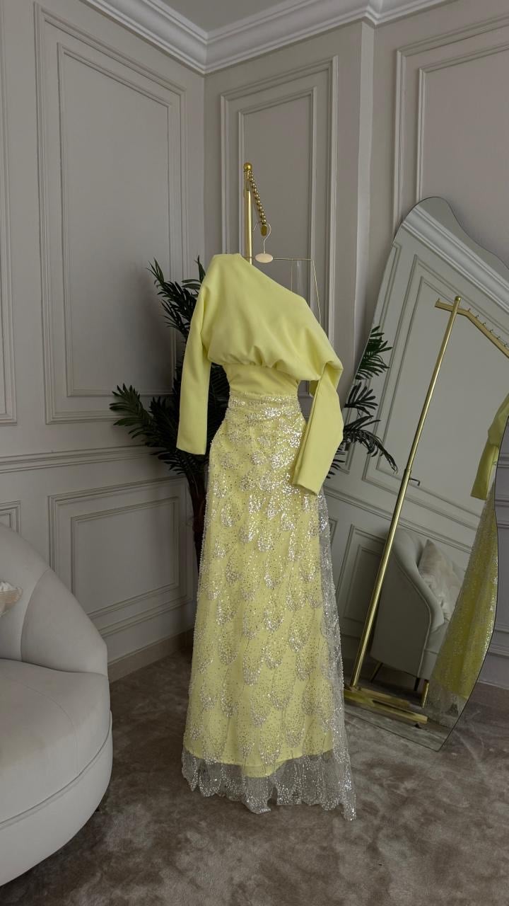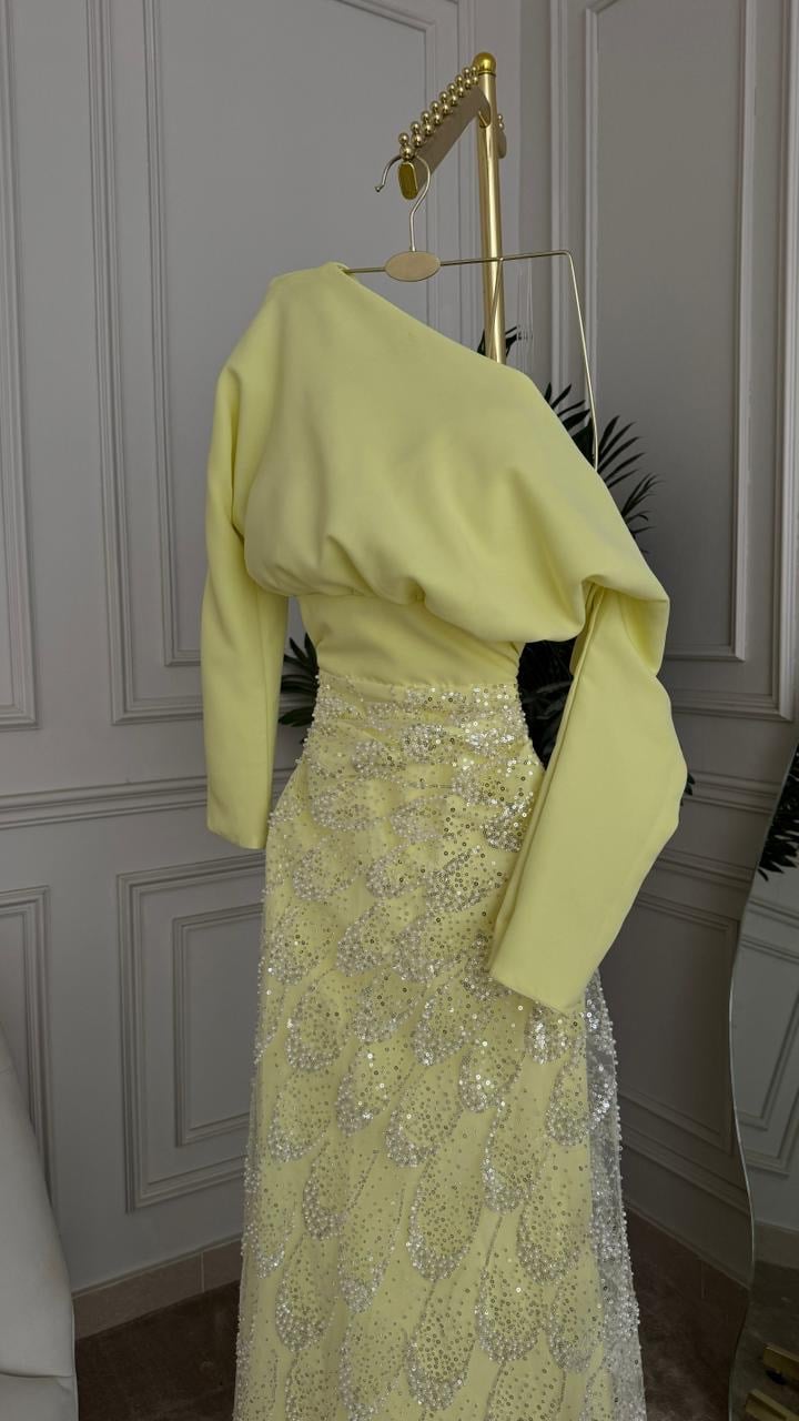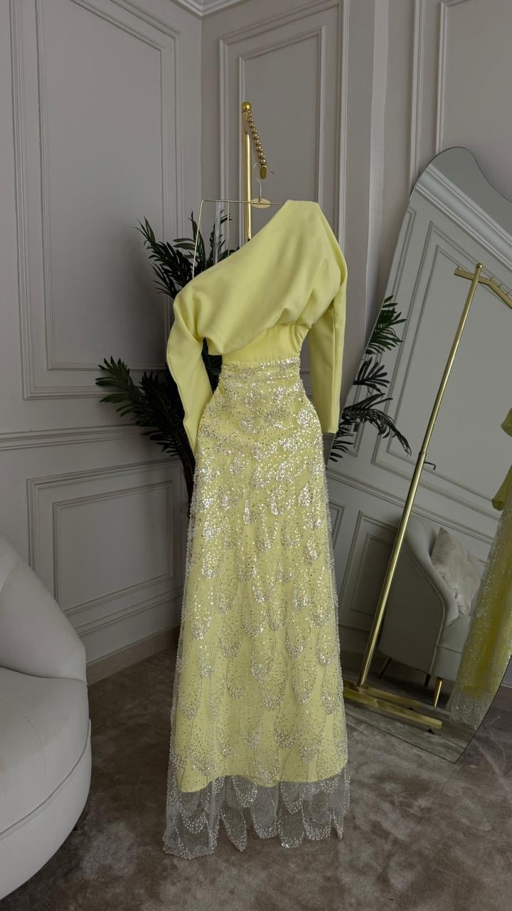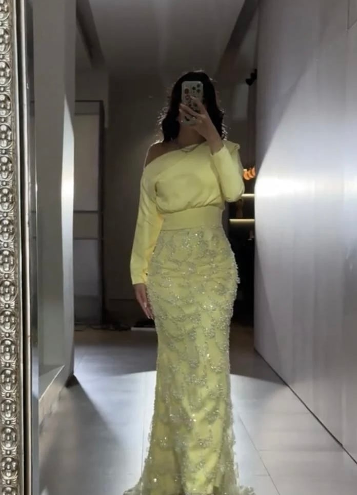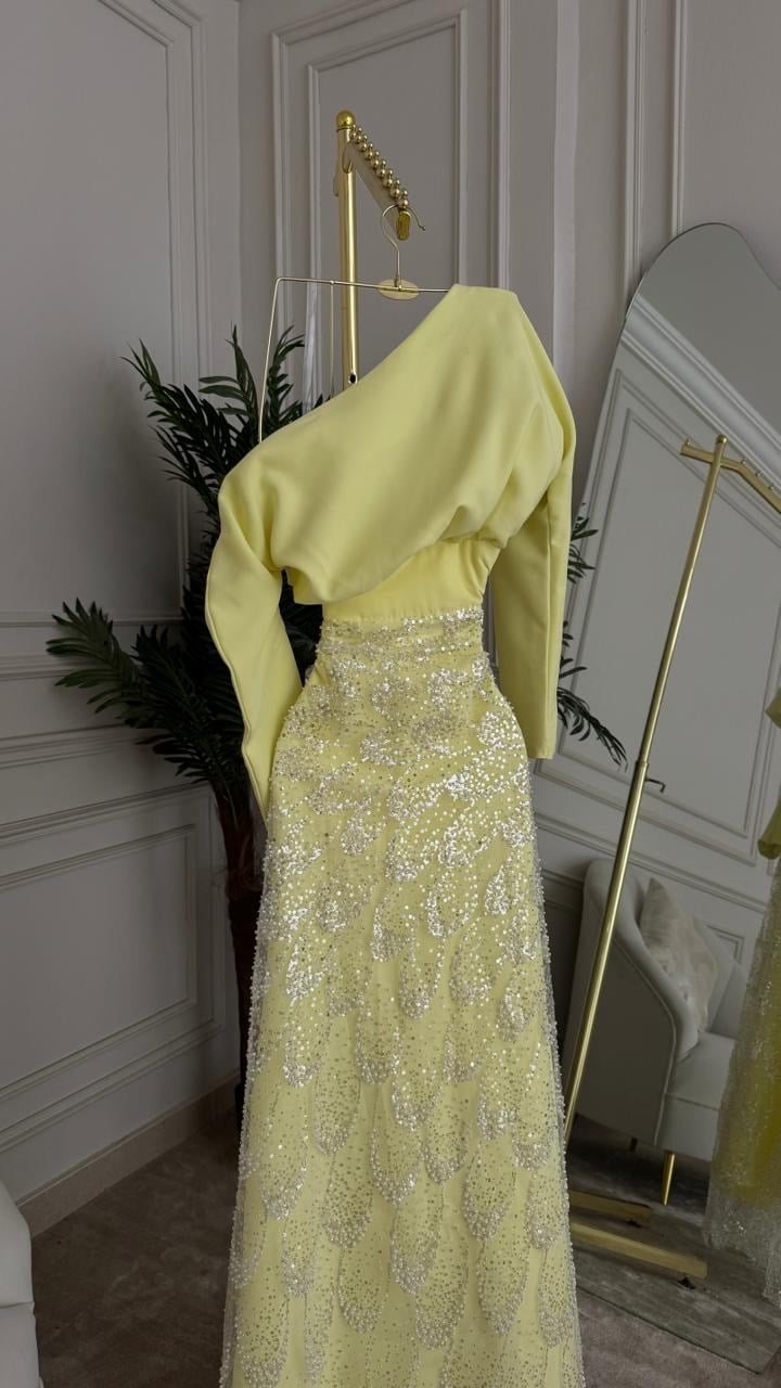 فستان سهرة أصفر فاخر بتصميم يجمع بين الجرأة والرقة في إطلالة واحدة.