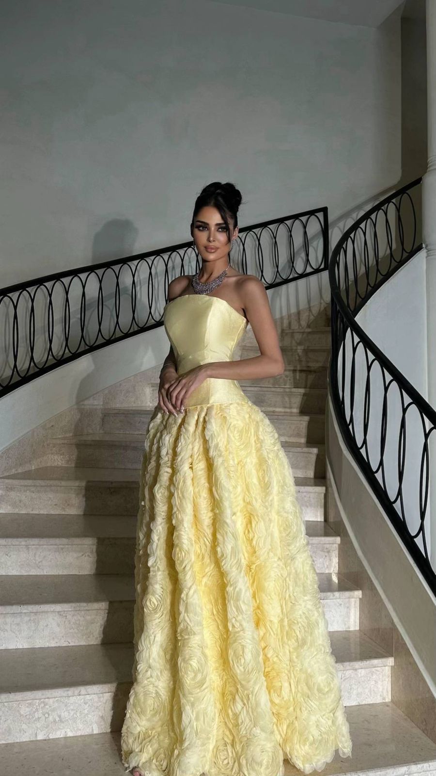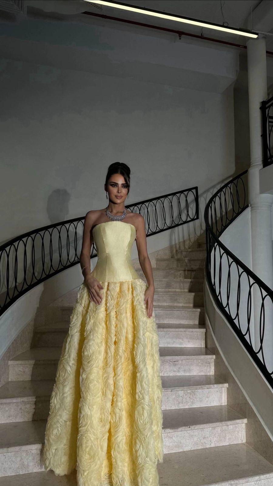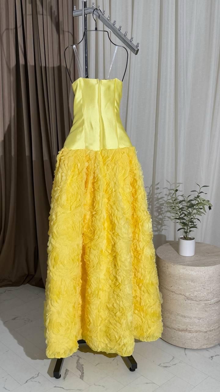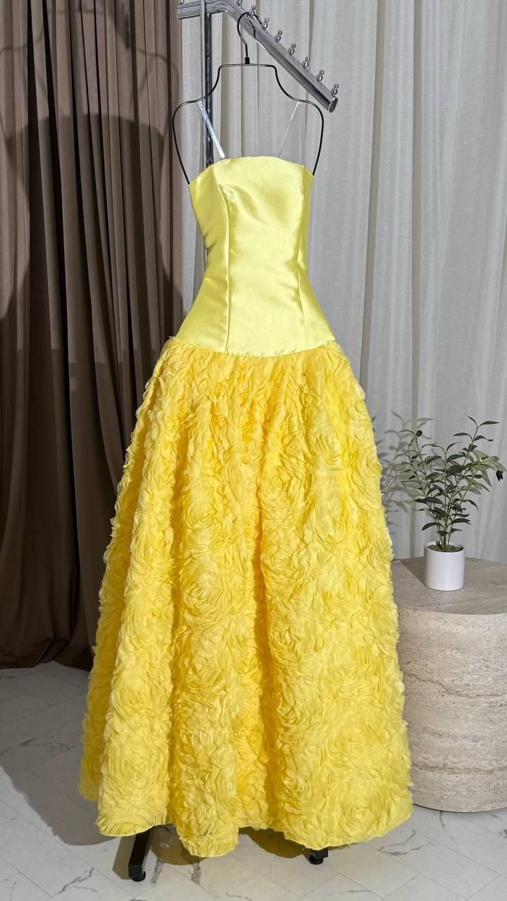 تألقي بإطلالة ملكية لا تُنسى مع هذا الفستان الأصفر الفاخر المصمم بعناية لكل امرأة تبحث عن التميز. يأتي الفستان بقصة أنثوية راقية تبدأ بجزء علوي من الساتان الفاخر، مصمم بقصة كورسيه مستقيمة بدون أكمام، تعانق الجسم بأناقة وتبرز جمال القوام. يتميز الصدر بخامة ناعمة ولمعة خفيفة تضيف لمسة من الرقي والرقة.