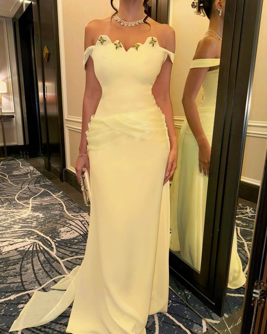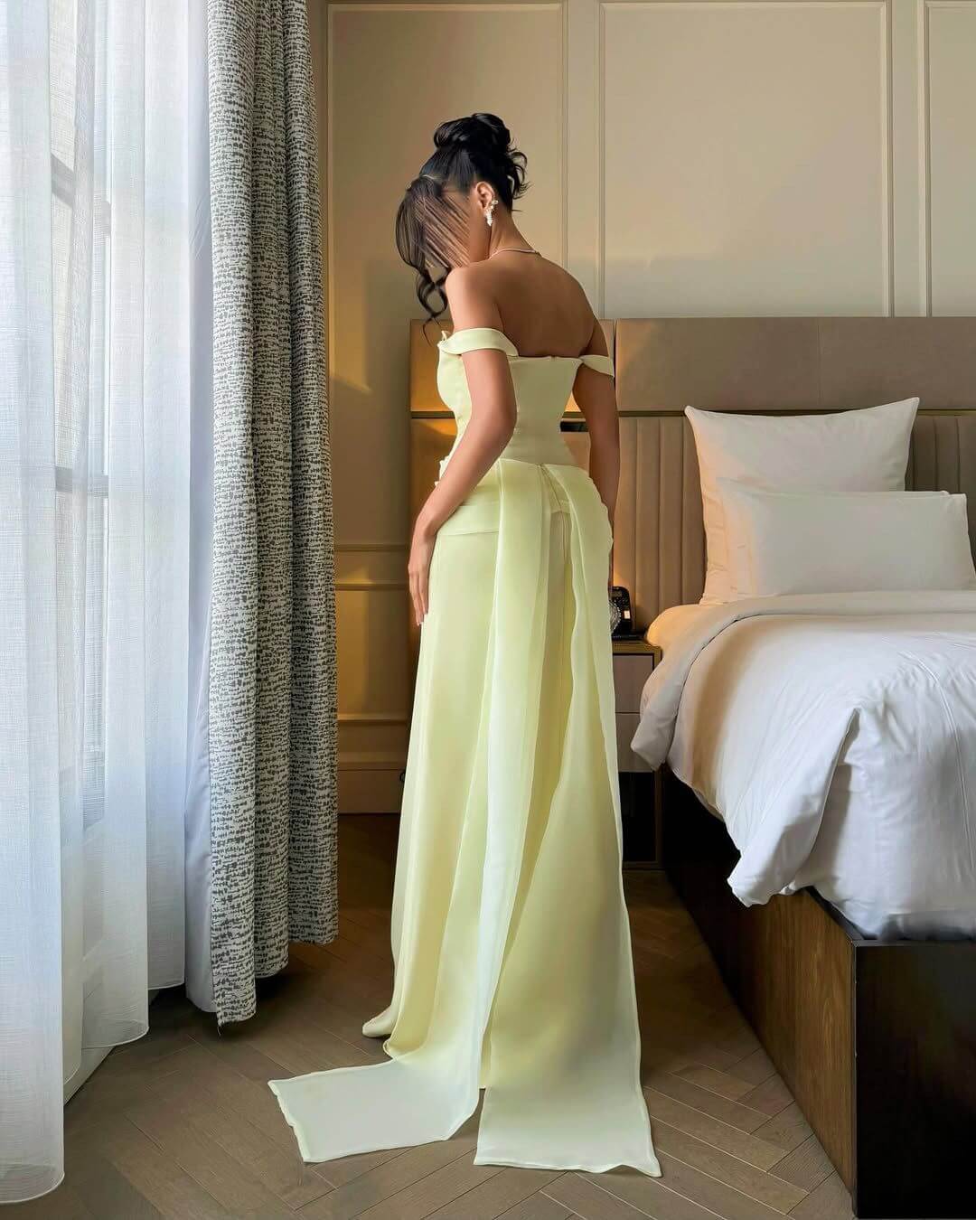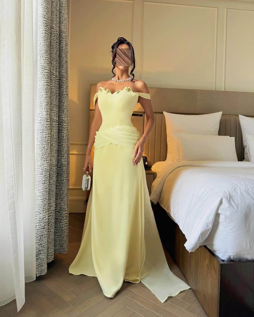 إطلالة ناعمة وأنثوية بتصميم راقٍ يجمع بين البساطة والأناقة. فستان سهرة بلون أصفر فاتح يتميز بقصة ناعمة منسدلة وانسيابية مثالية للمناسبات الرومانسية والخطوبة.
